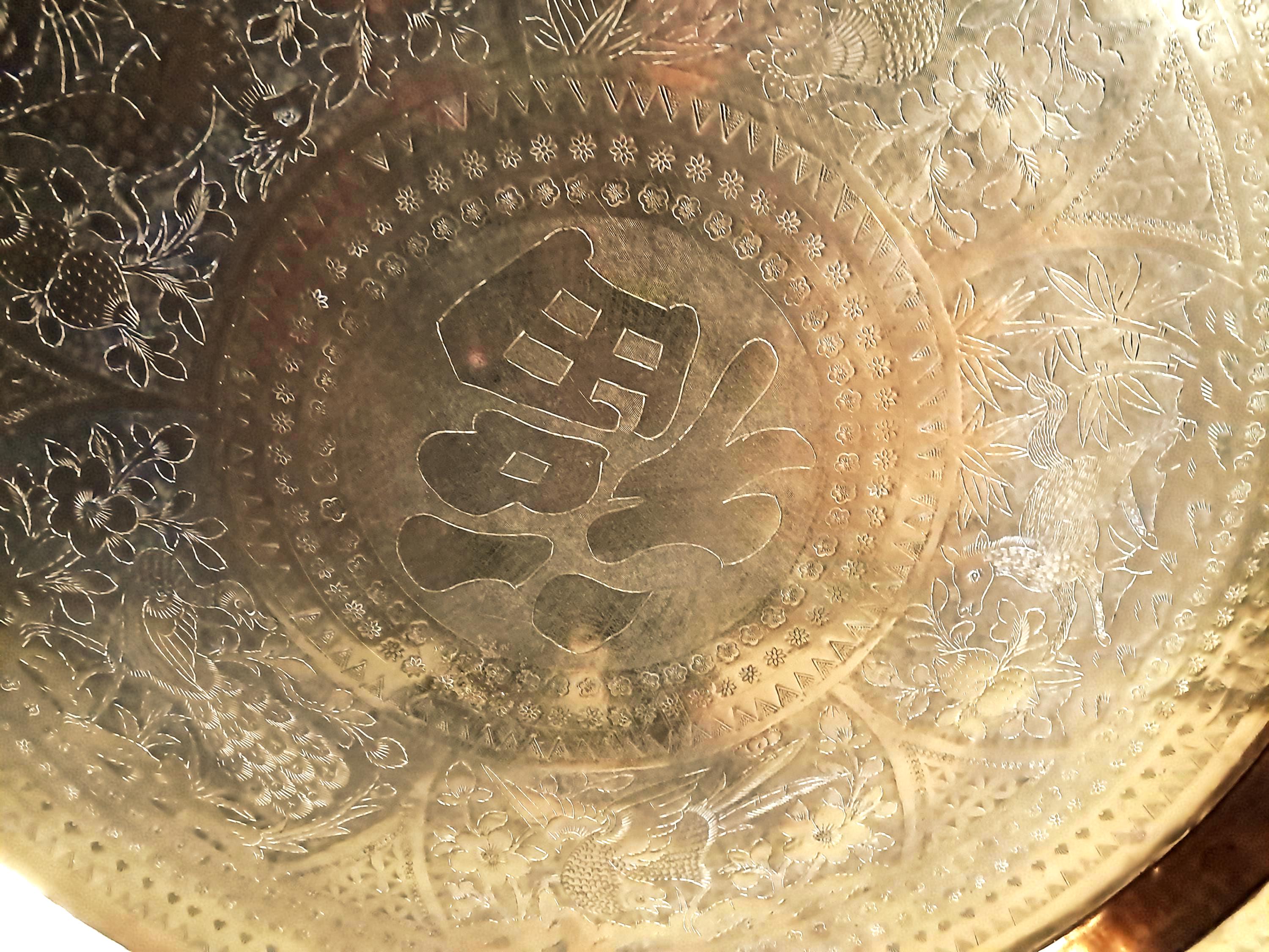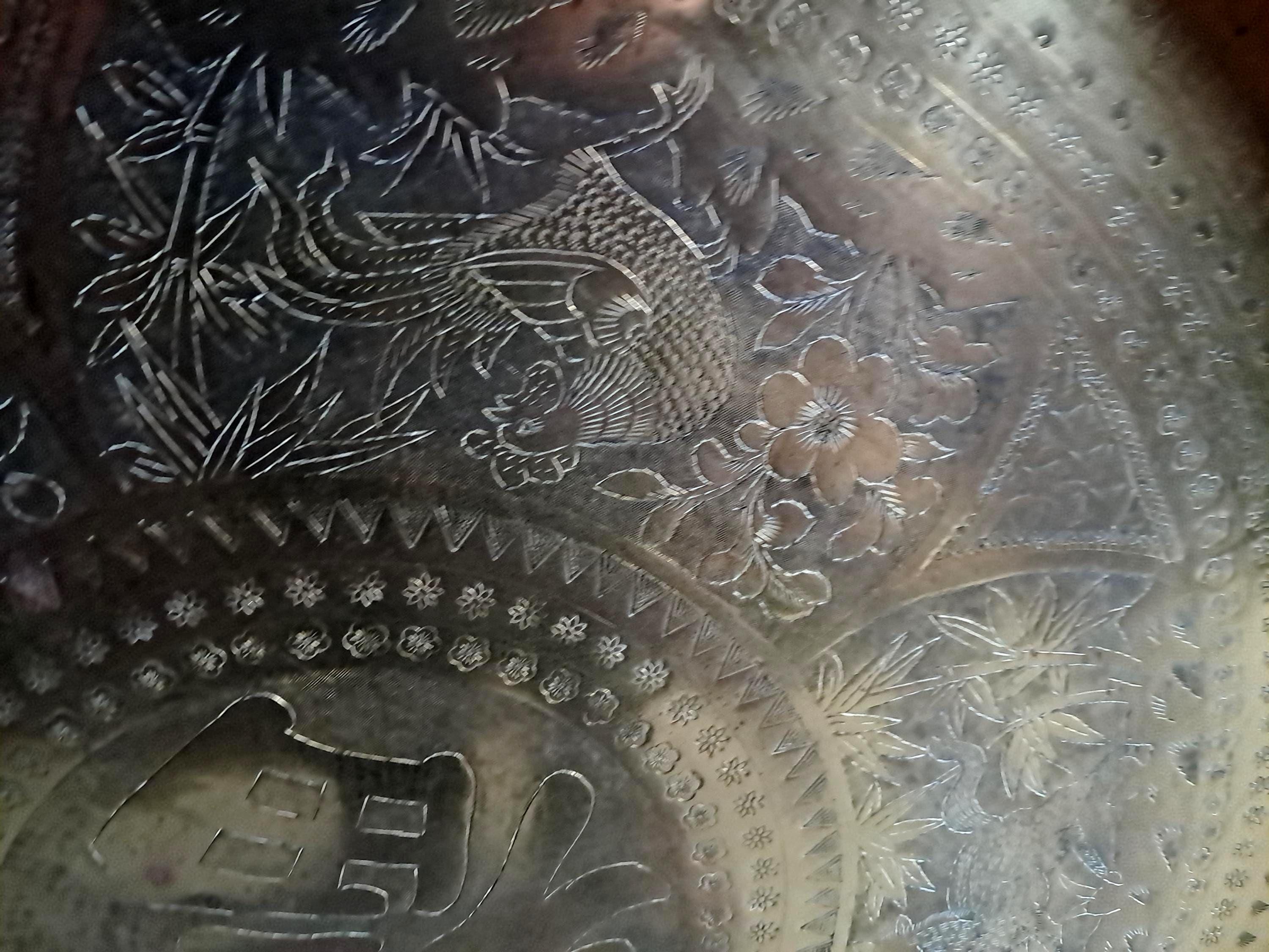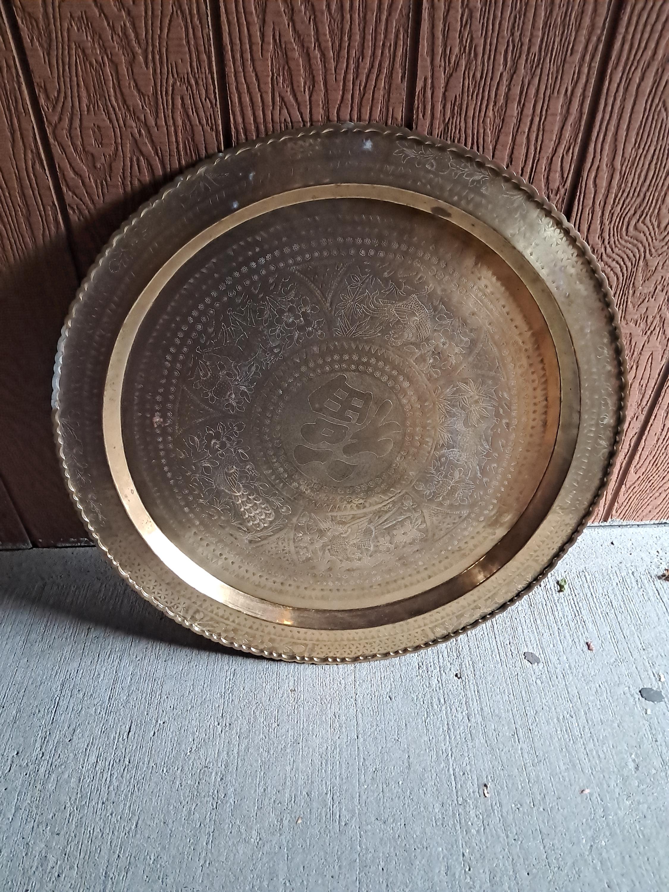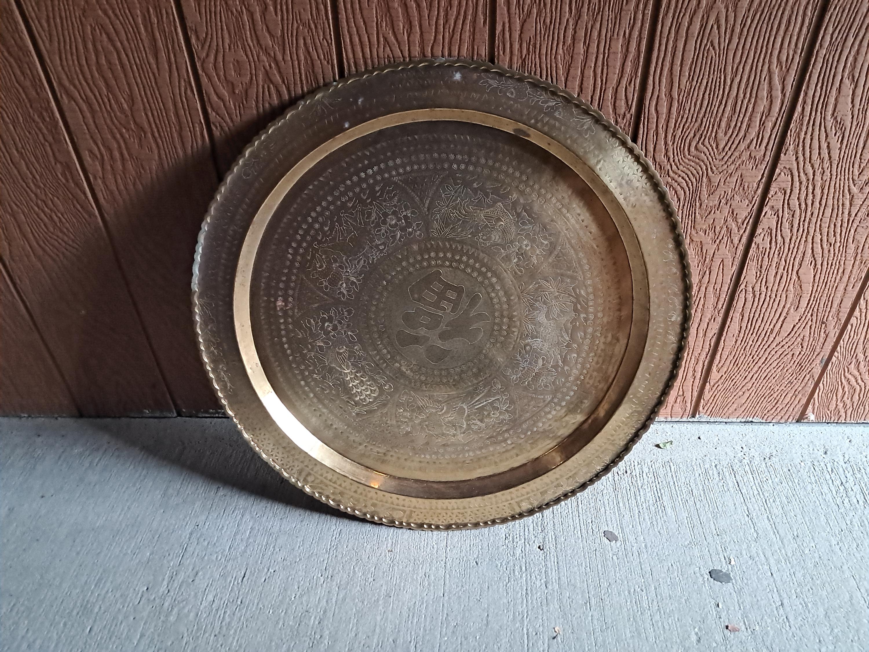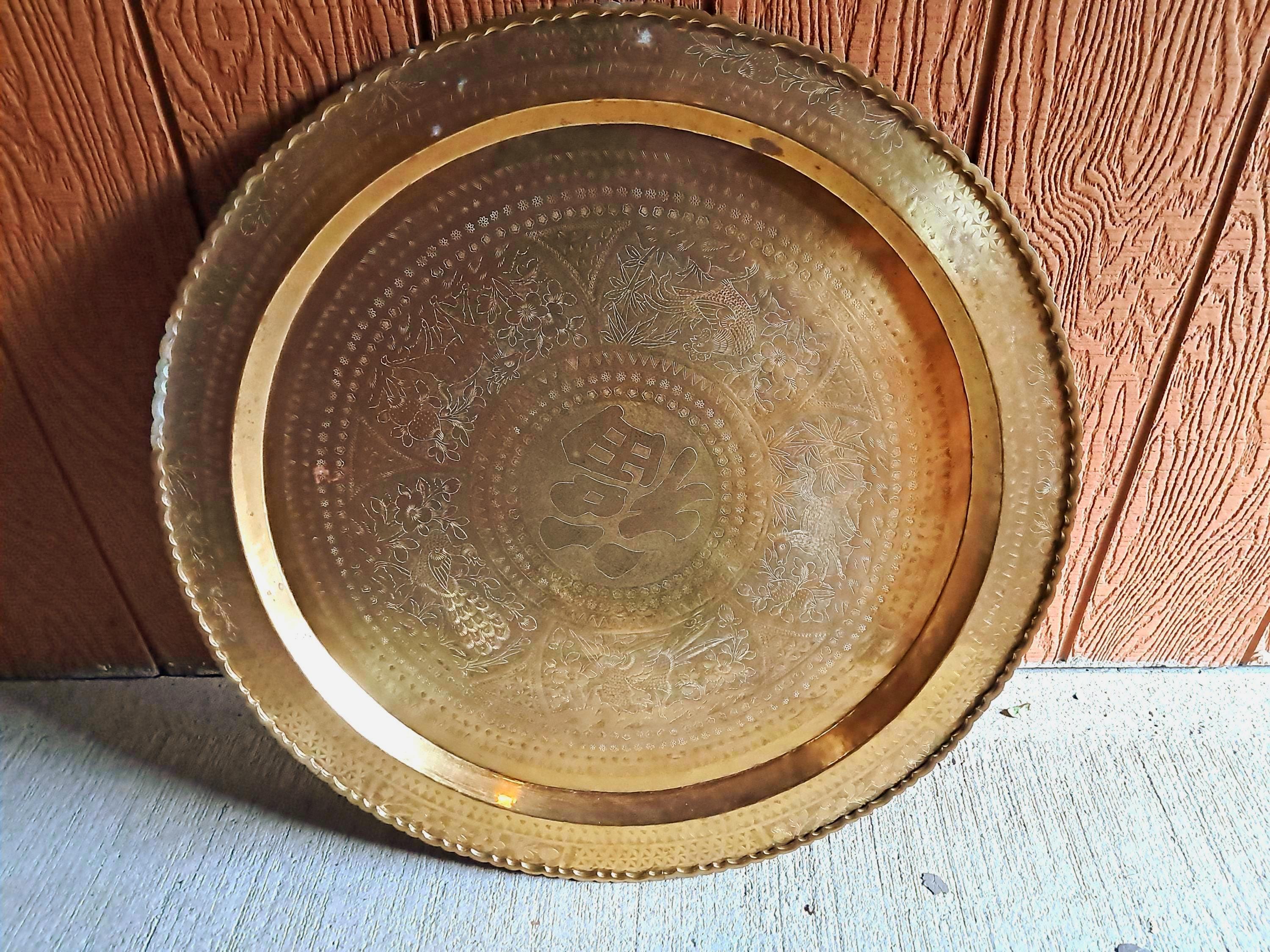 Wonderfully functional decor is a great space saver, keep this ornate etched Chinese tray on the wall as a decor item or use as serving tray or table top decor and display. Intricately etched with a 29" diameter by 1.5" deep .Happiness ideogram in the center surrounded by animals , all among geometric repeating pattern etchings around the rim and between the images at rolled edge - Hook on reverse for hanging, no signature, front is almost completely covered in etchings - patina can be polished - no dents or damage of note.