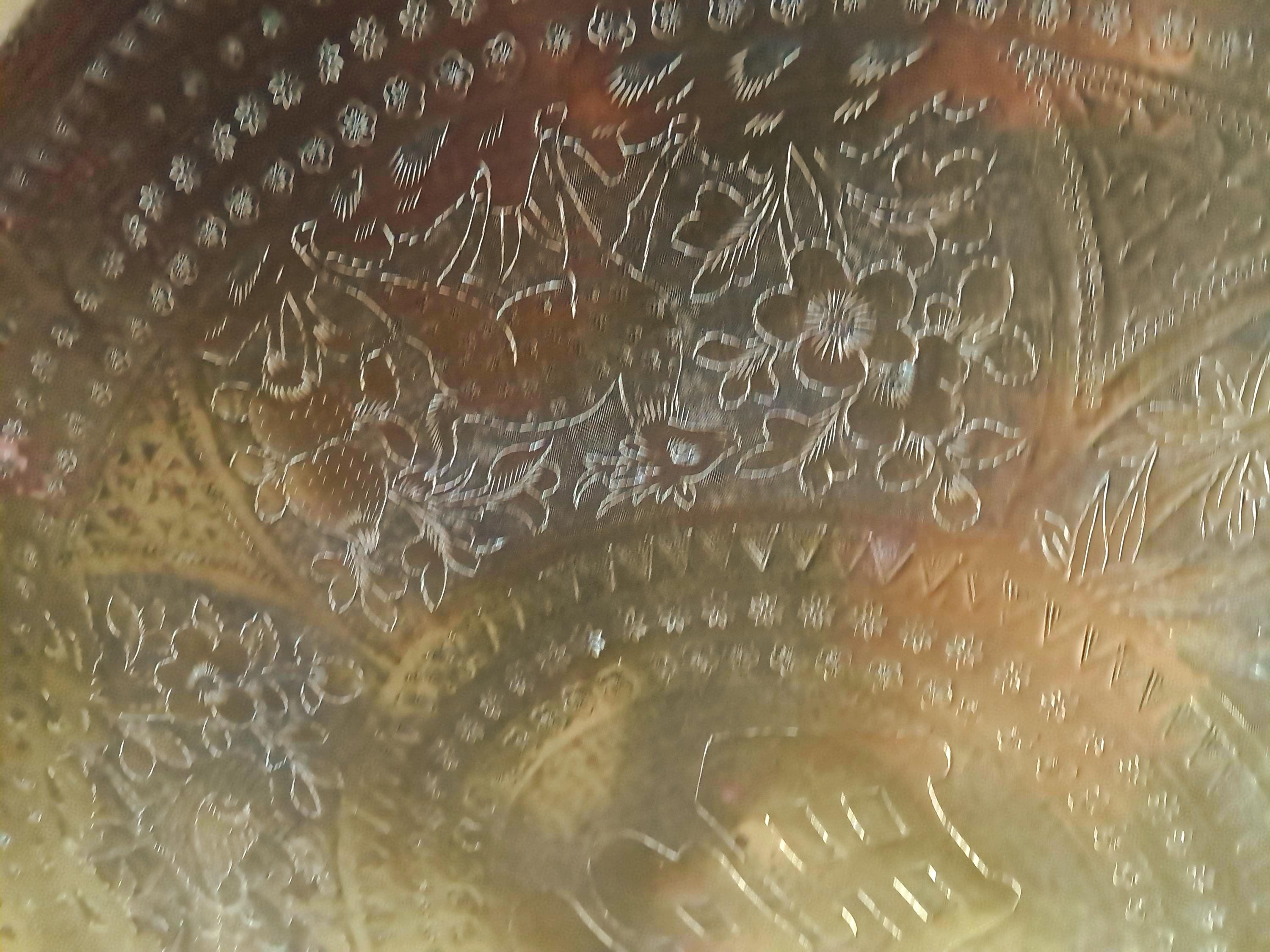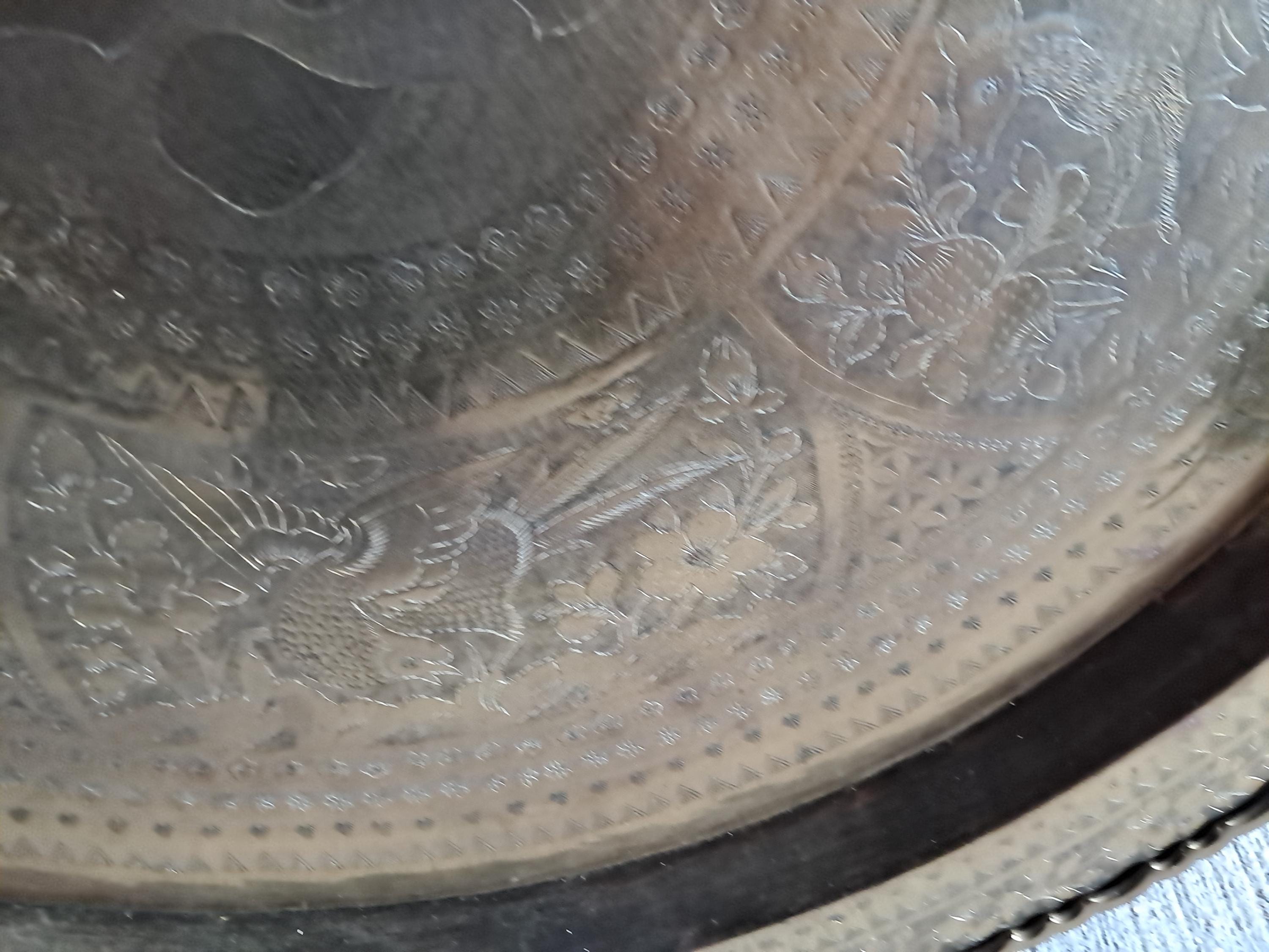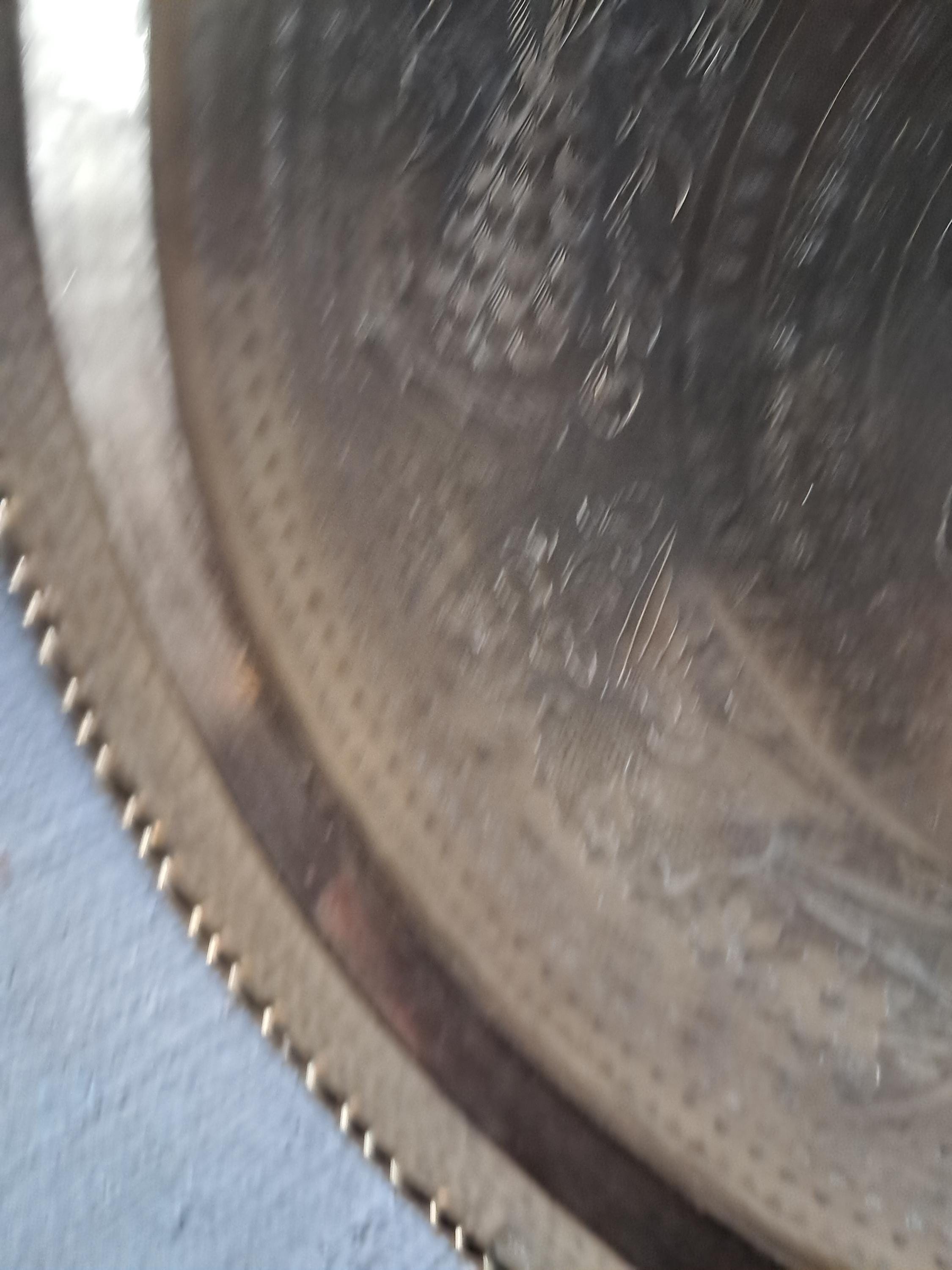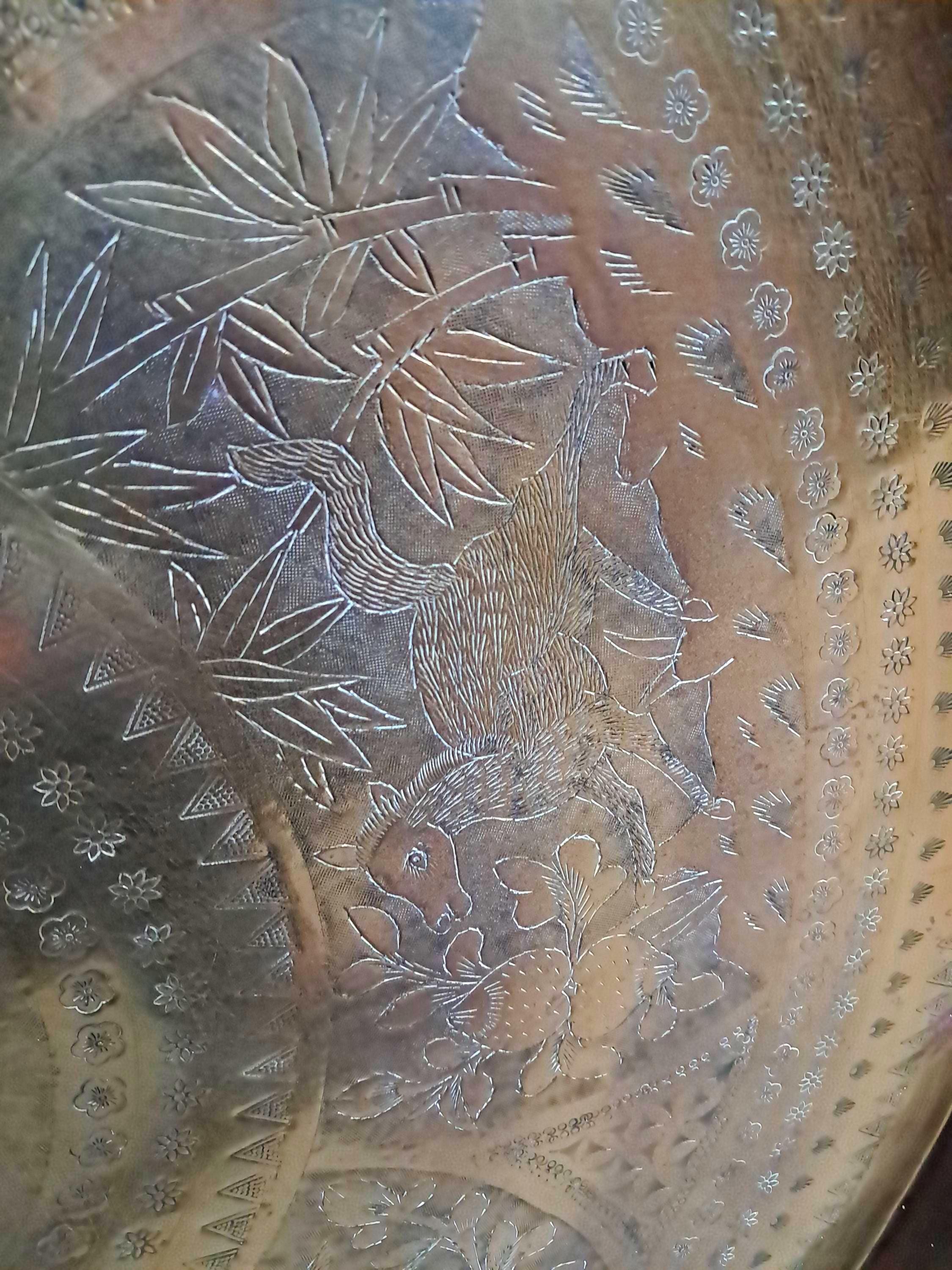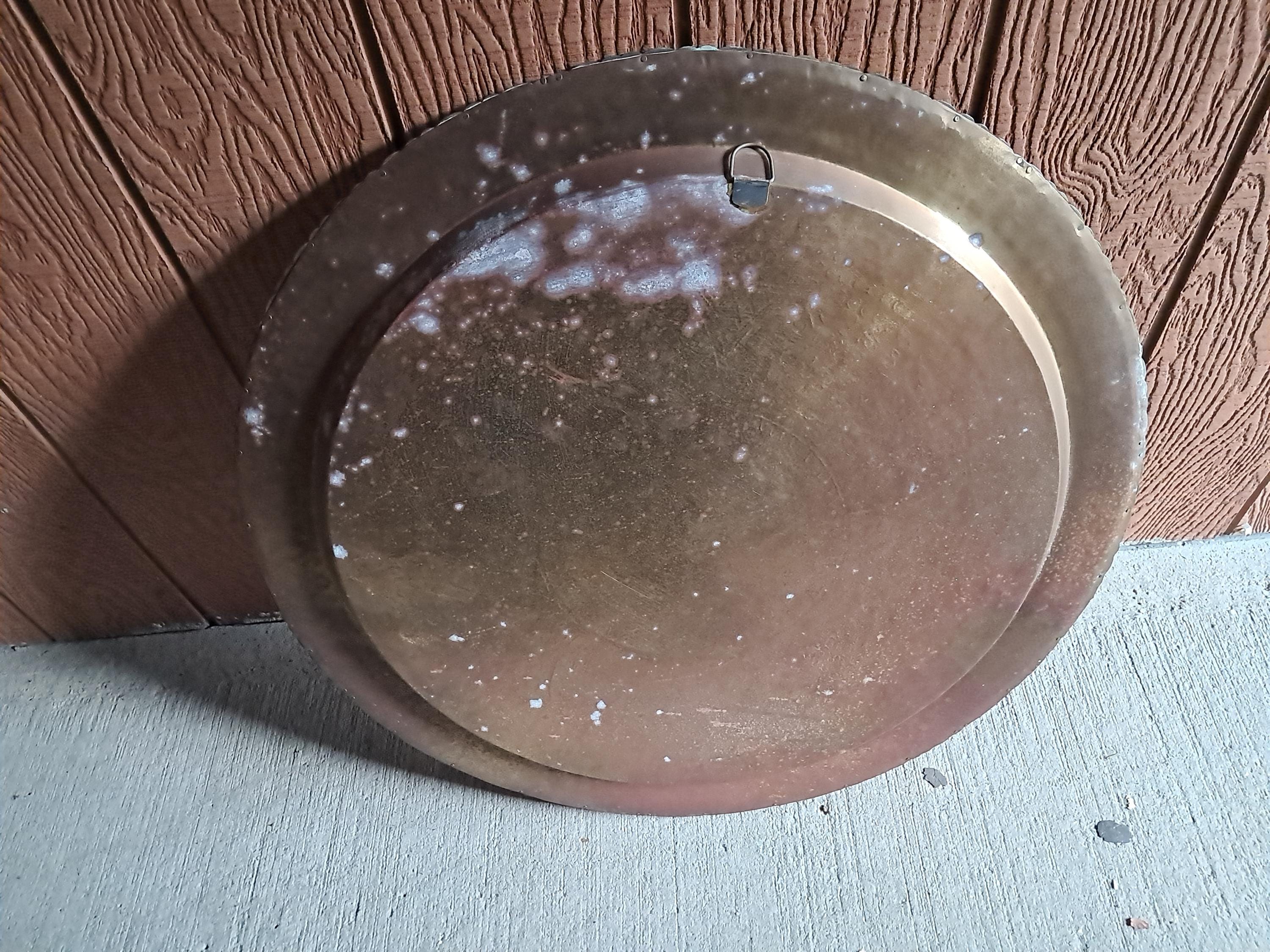 Wonderfully functional decor is a great space saver, keep this ornate etched Chinese tray on the wall as a decor item or use as serving tray or table top decor and display. Intricately etched with a 29" diameter by 1.5" deep .Happiness ideogram in the center surrounded by animals , all among geometric repeating pattern etchings around the rim and between the images at rolled edge - Hook on reverse for hanging, no signature, front is almost completely covered in etchings - patina can be polished - no dents or damage of note.
