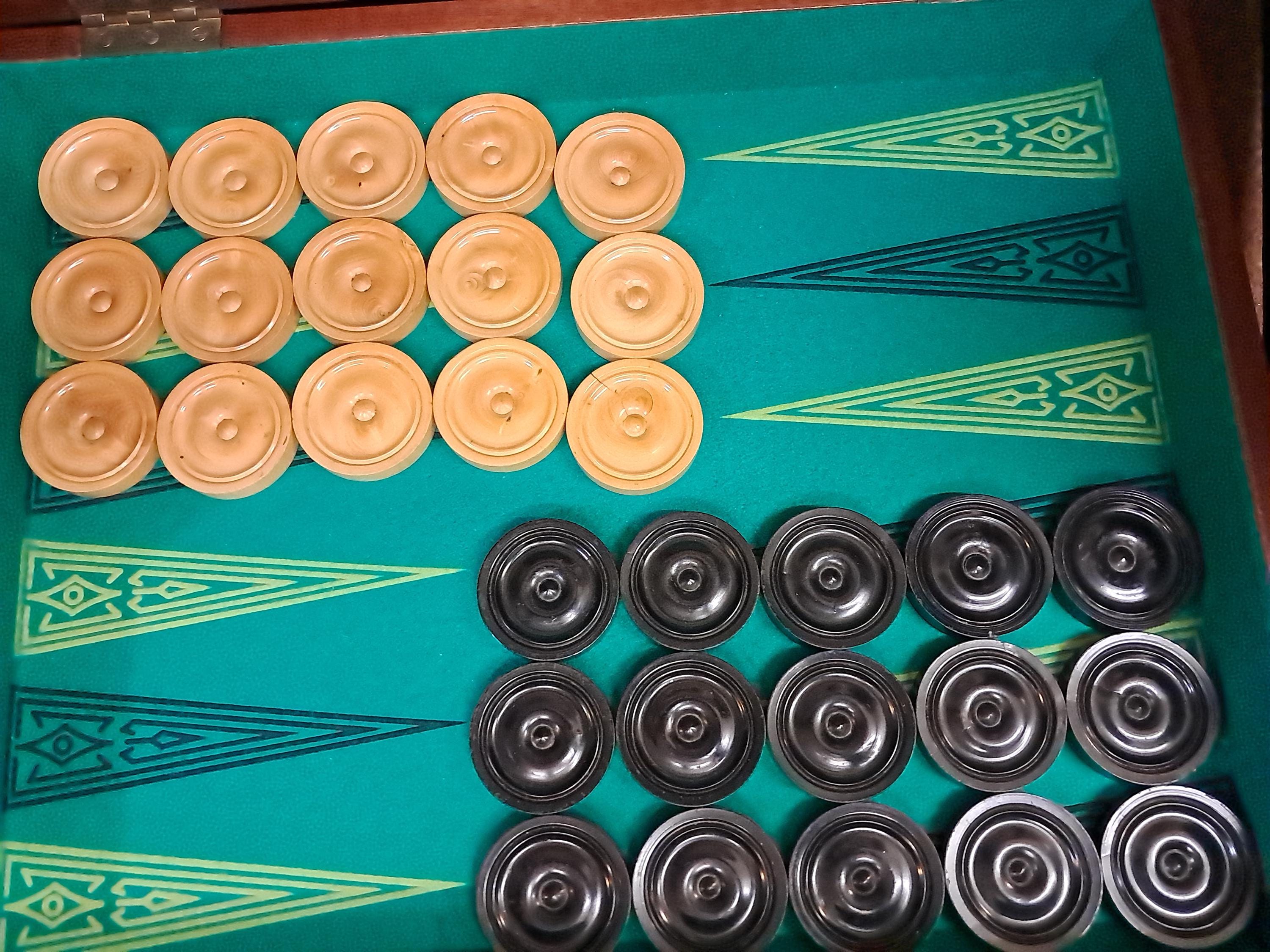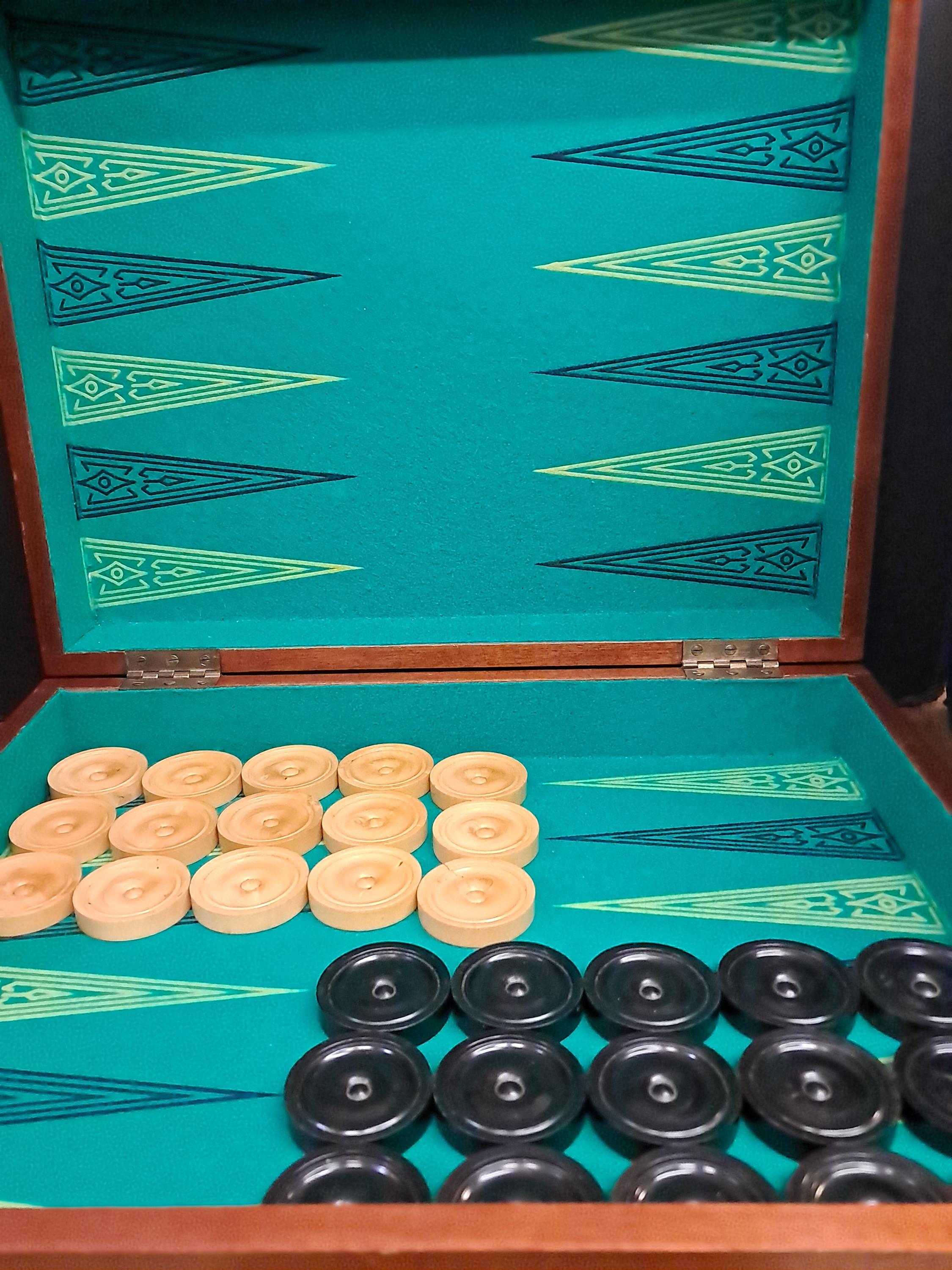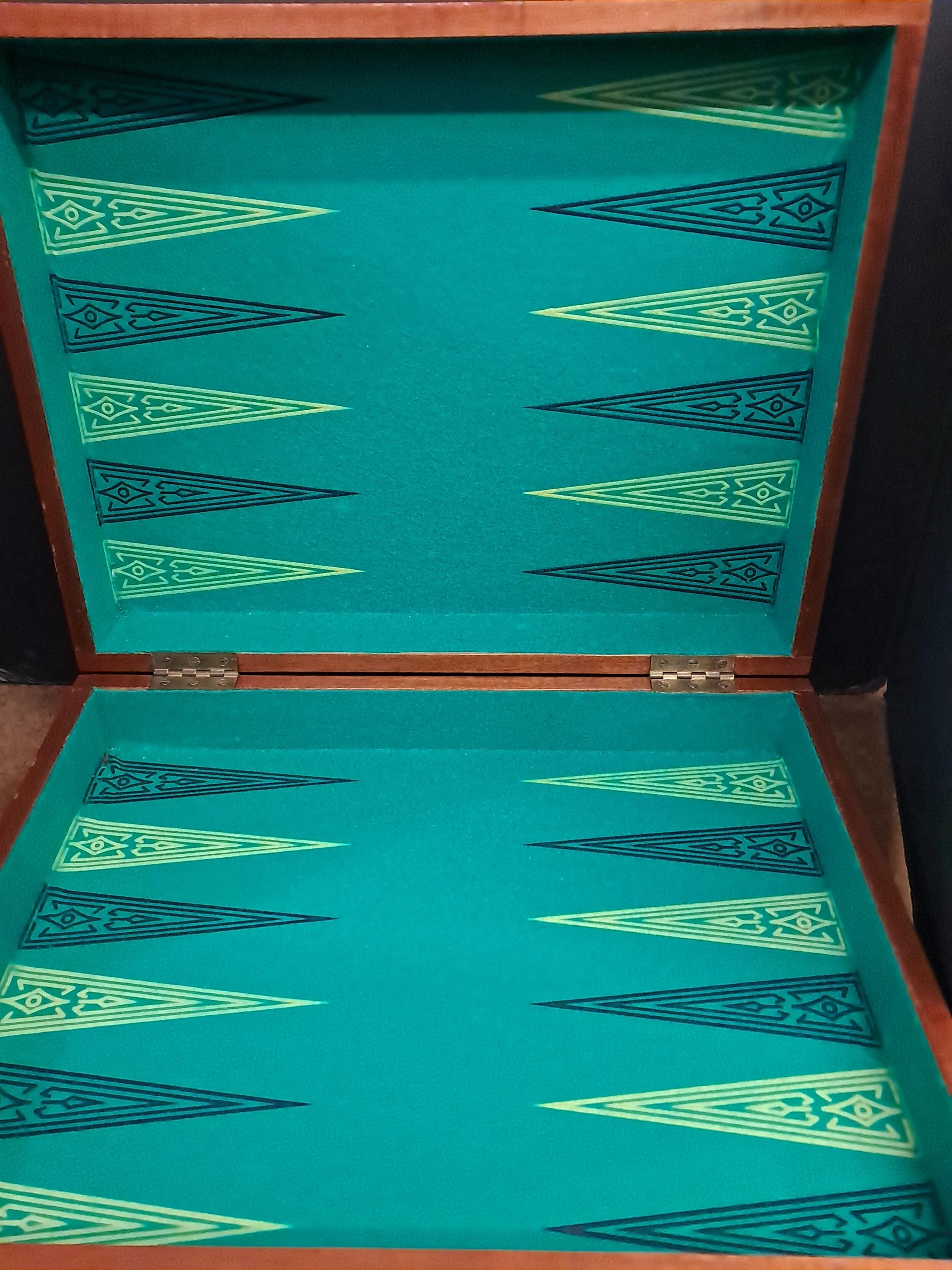 The appeal, for the purists, is that it still has its original baize playing surface which is in good condition This game is totally authentic. Purchased at Estate Sale as an ‘objet d’art’ laid out on a coffee table - or as a rare playing board for the backgammon enthusiast.