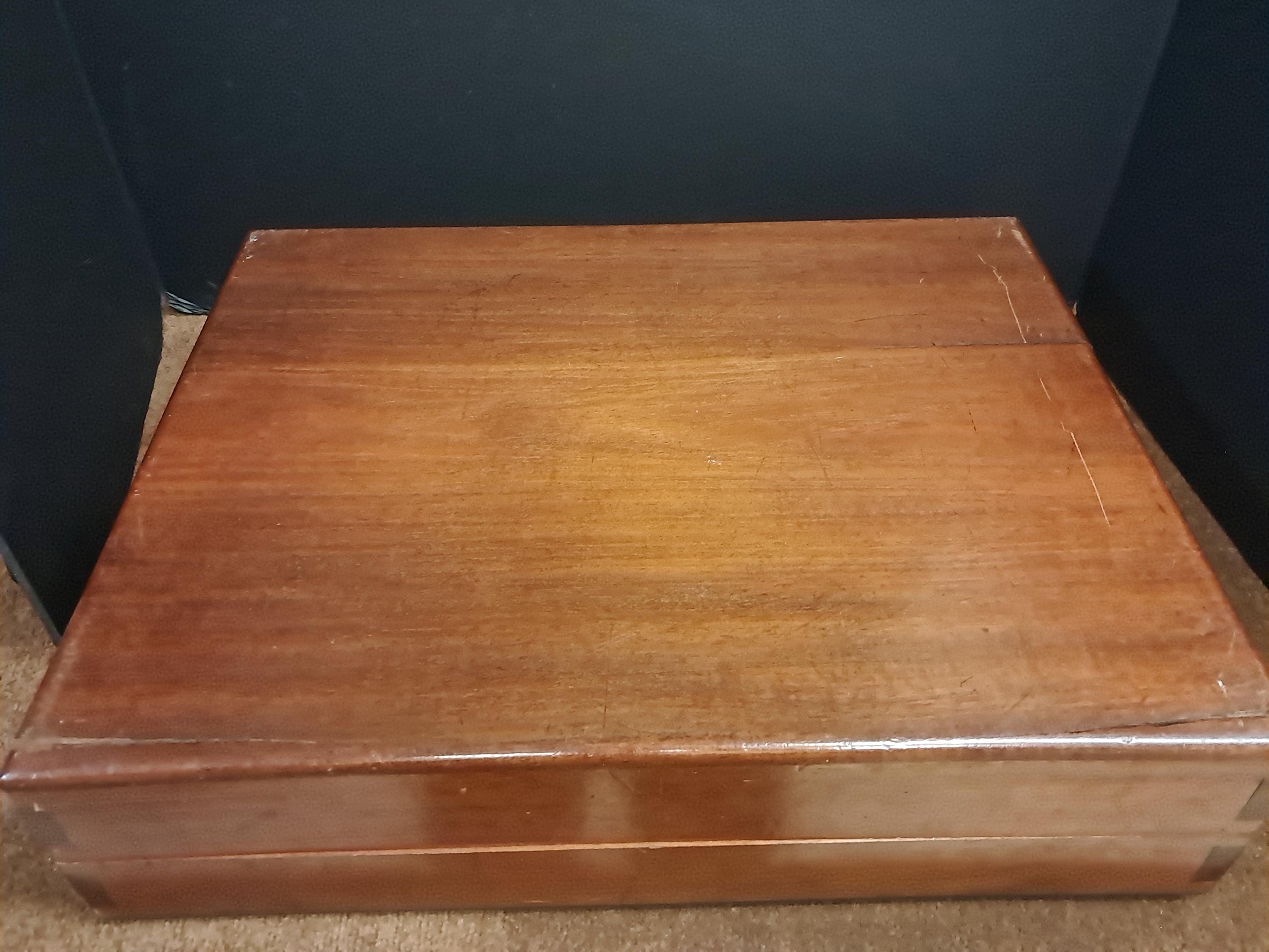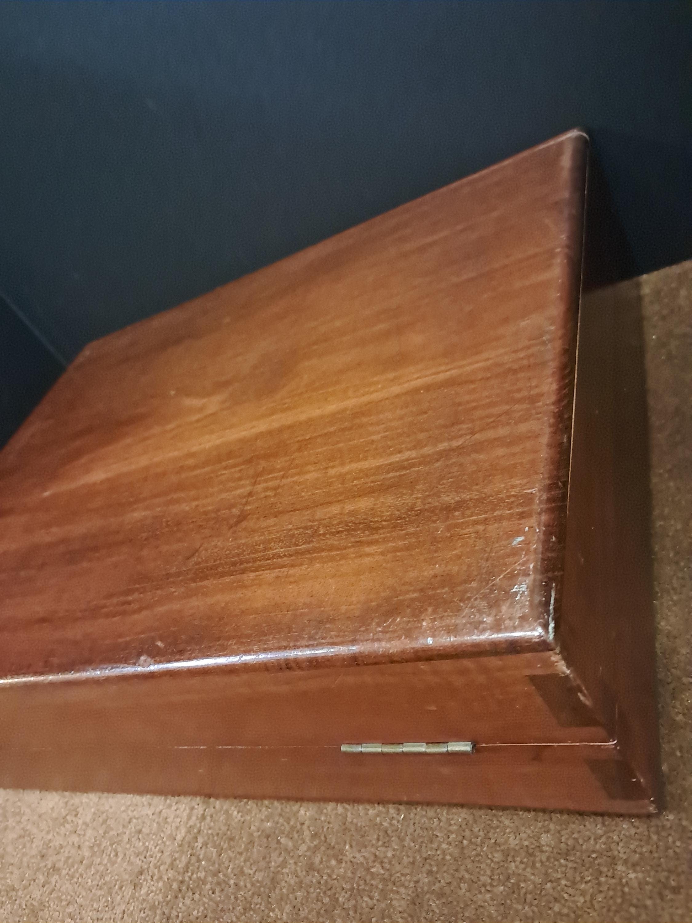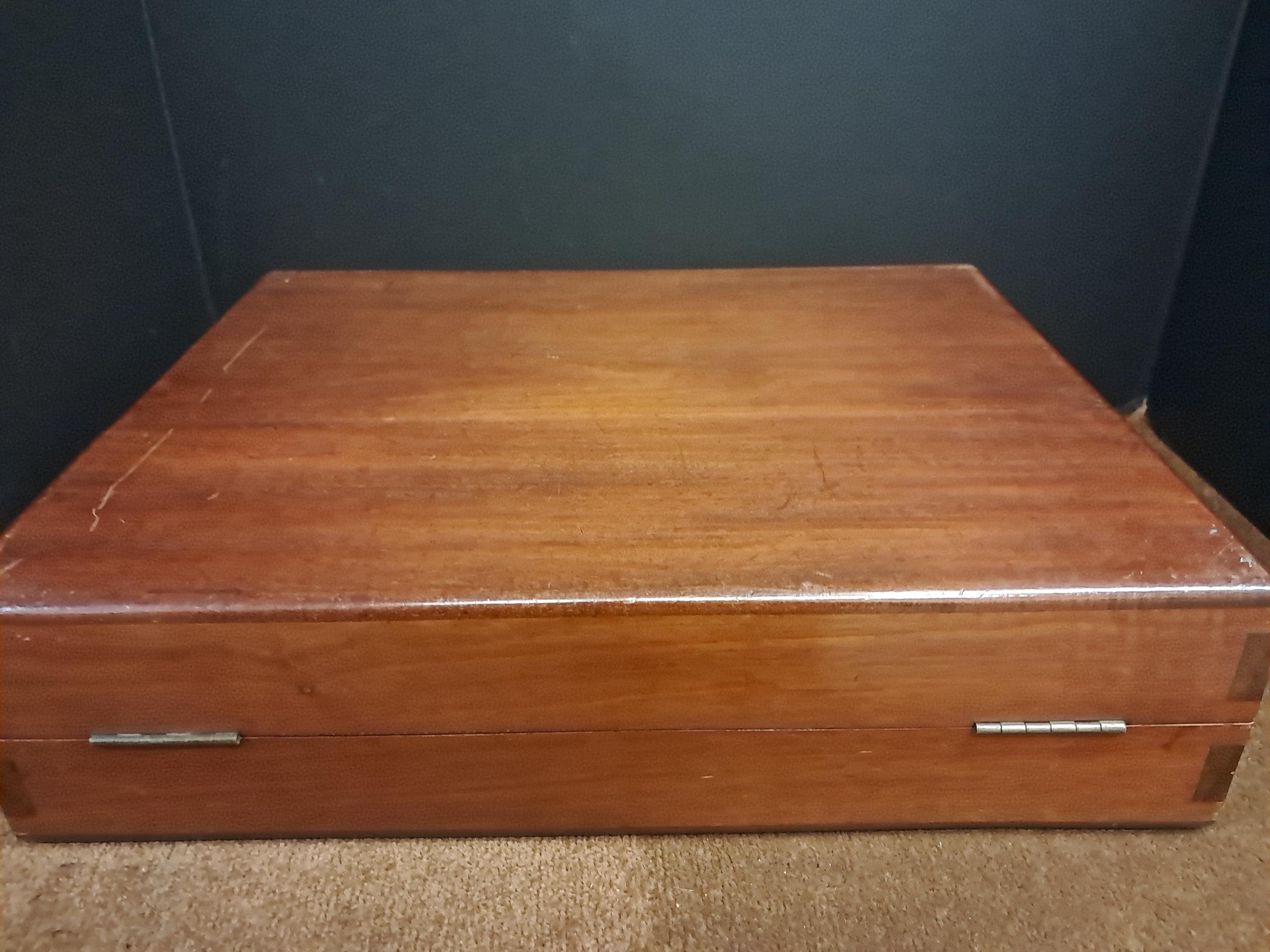 This is a full-size (tournament) board measuring (Closed ) 17.5" wide x 14" tall x 4" deep and the joinery uses the beautiful 'dove tail' joints popular at the time. The outer surface of the box has a magnificent walnut wool board. The outer surface of the board shows some light scuffing consistent with the game's antiquity - but overall it is in good condition.