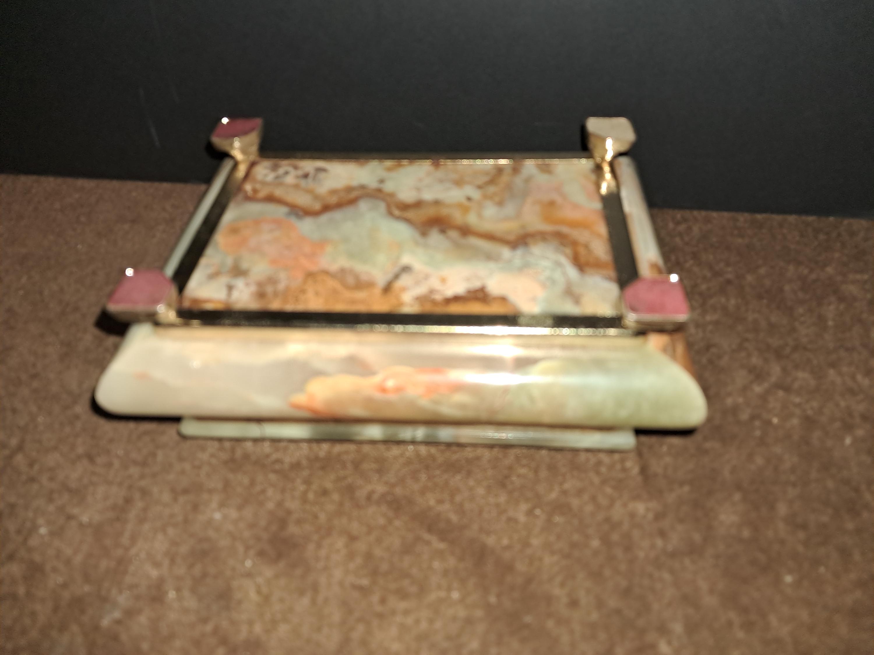Brass color mounts and hinges to the hinged lid, it's a very solid and sturdy trinket or jewelry box suitable for him or for her.