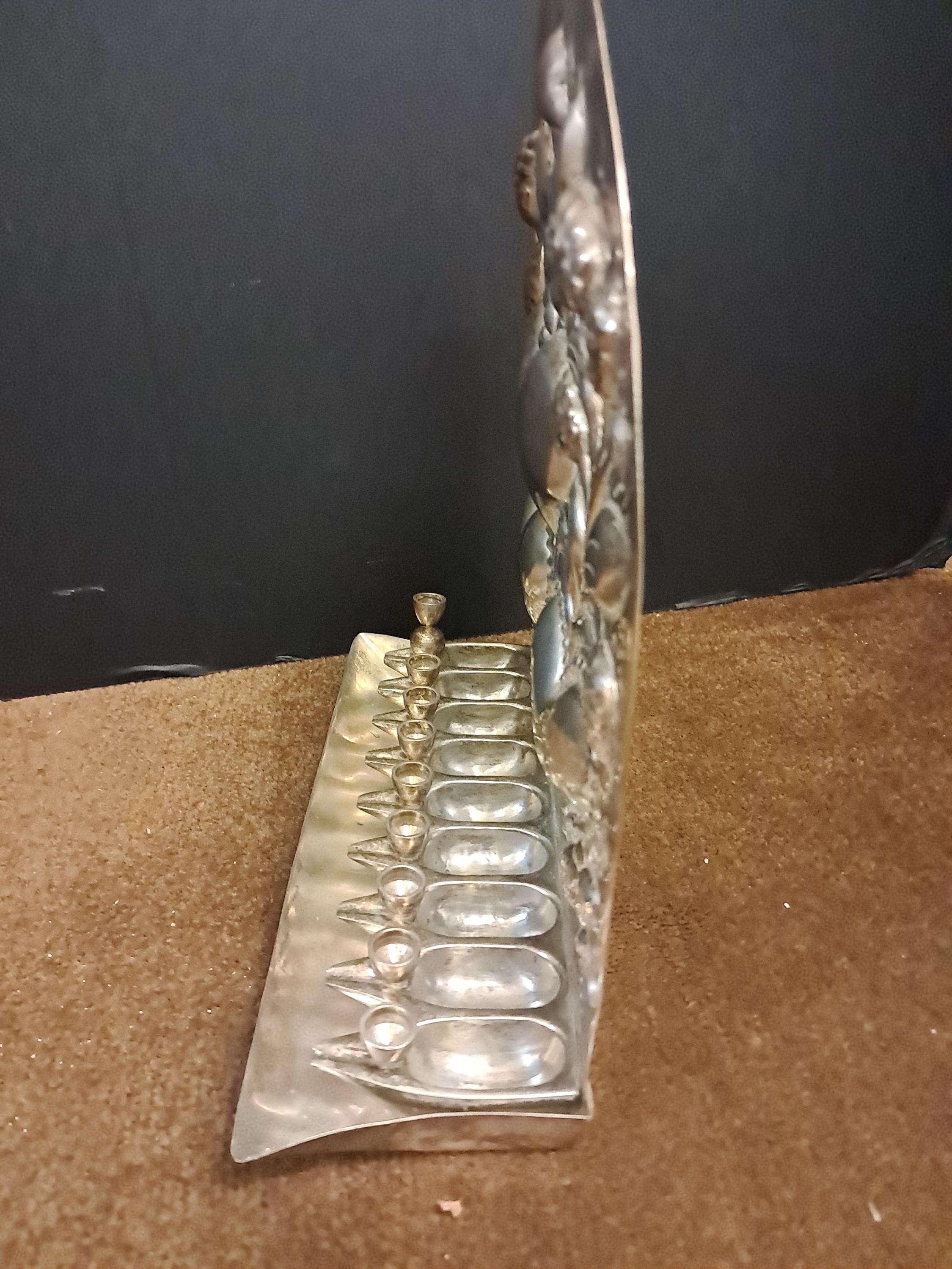 Many Dutch menorahs feature eight oil wells for the nights of Hanukkah plus a shamash, often integrated directly into the backplate or a raised base