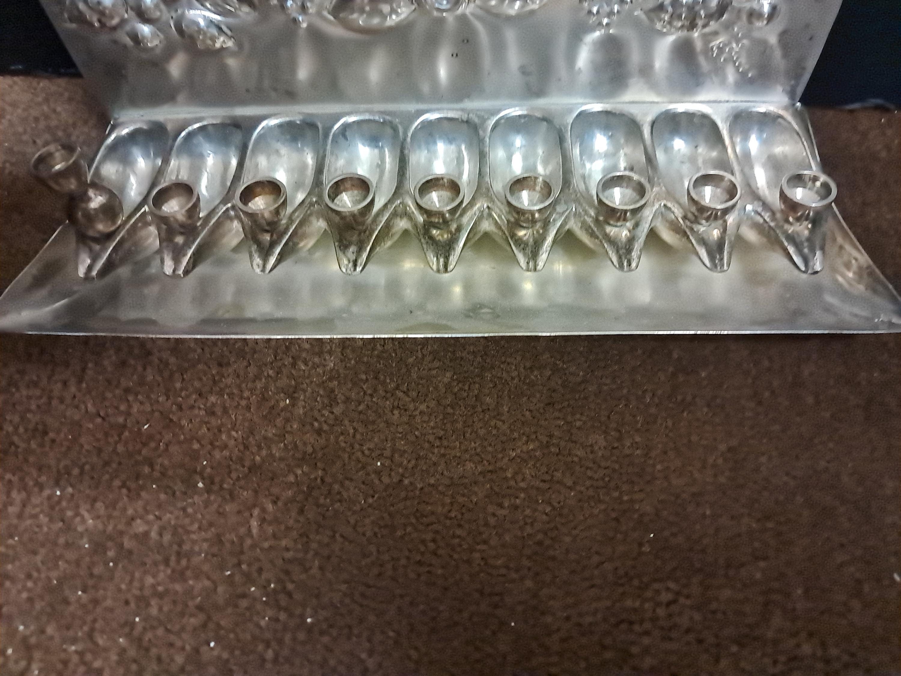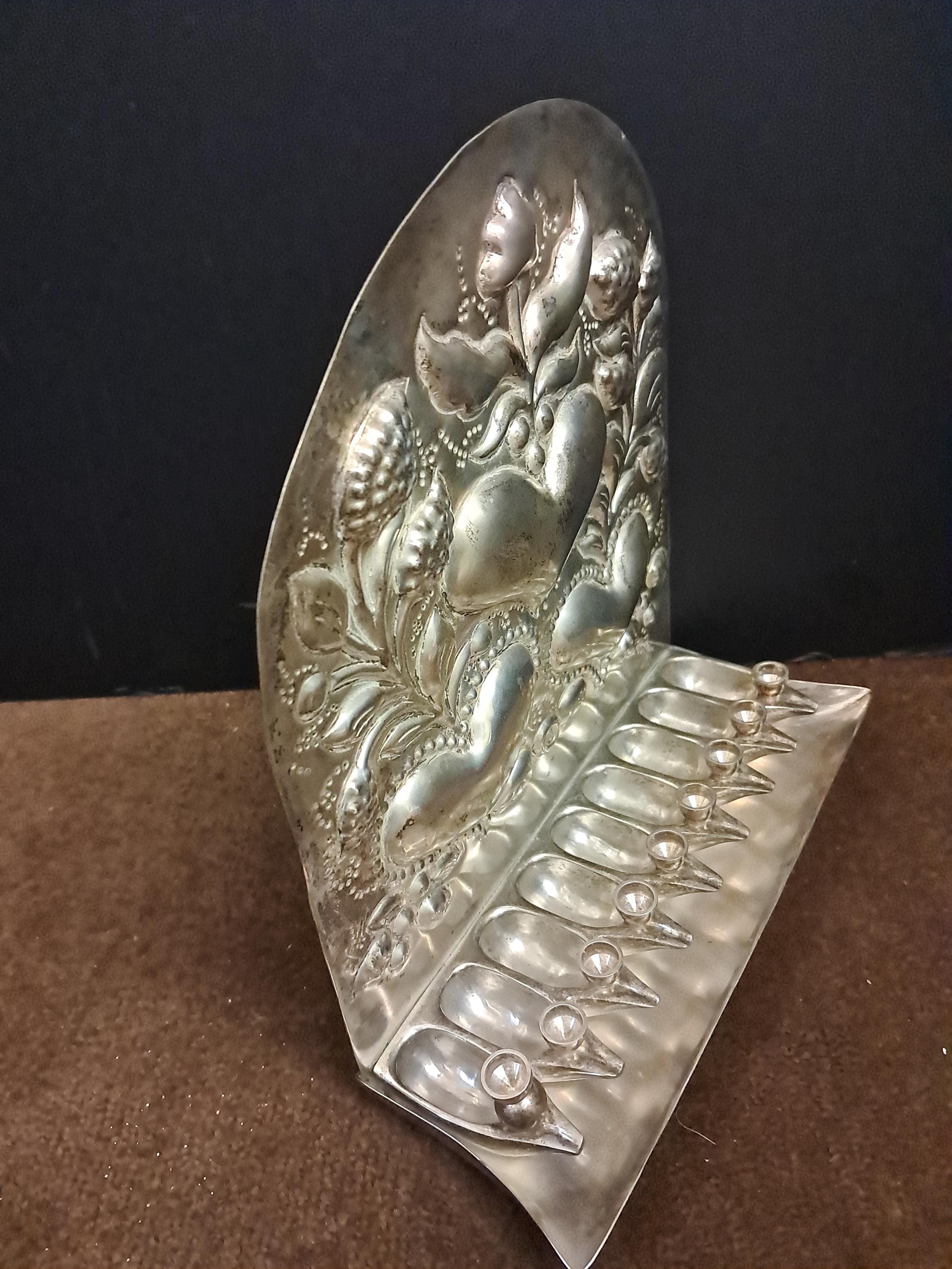 19th-century Dutch menorahs were commonly crafted from brass or copper alloy with various metalworking techniques: pierced, repoussé, chased, and punched designs were used to decorate the backplates and oil wells