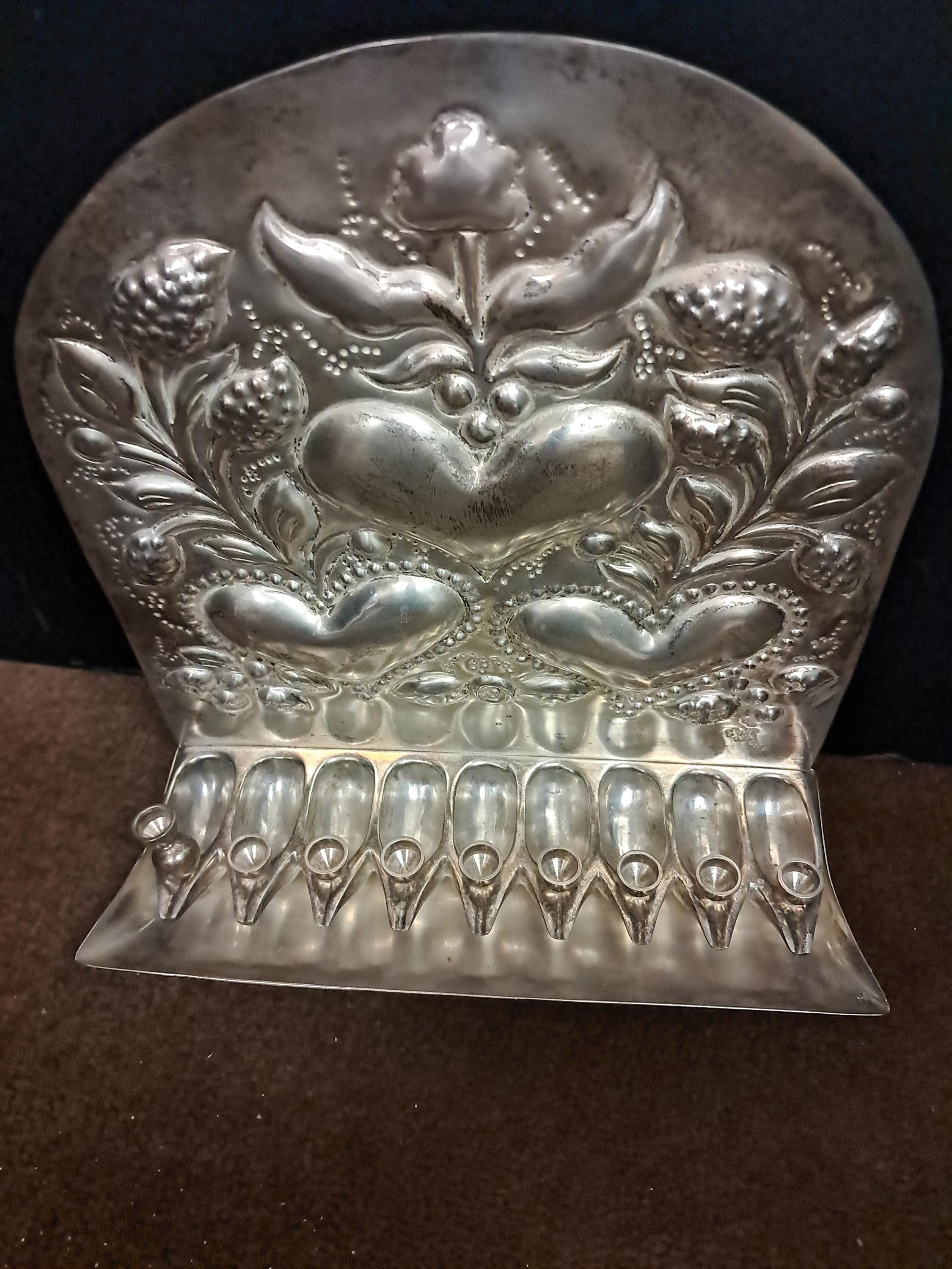 In summary, Dutch 19th-century Hanukkah lamps combine religious function, meticulous metalwork, and Dutch artistic influences, featuring brass or bronze construction, pierced and chased ornamentation, and symbolic motifs relevant to Jewish culture of the era. They remain highly collectible examples of Jewish ceremonial art.