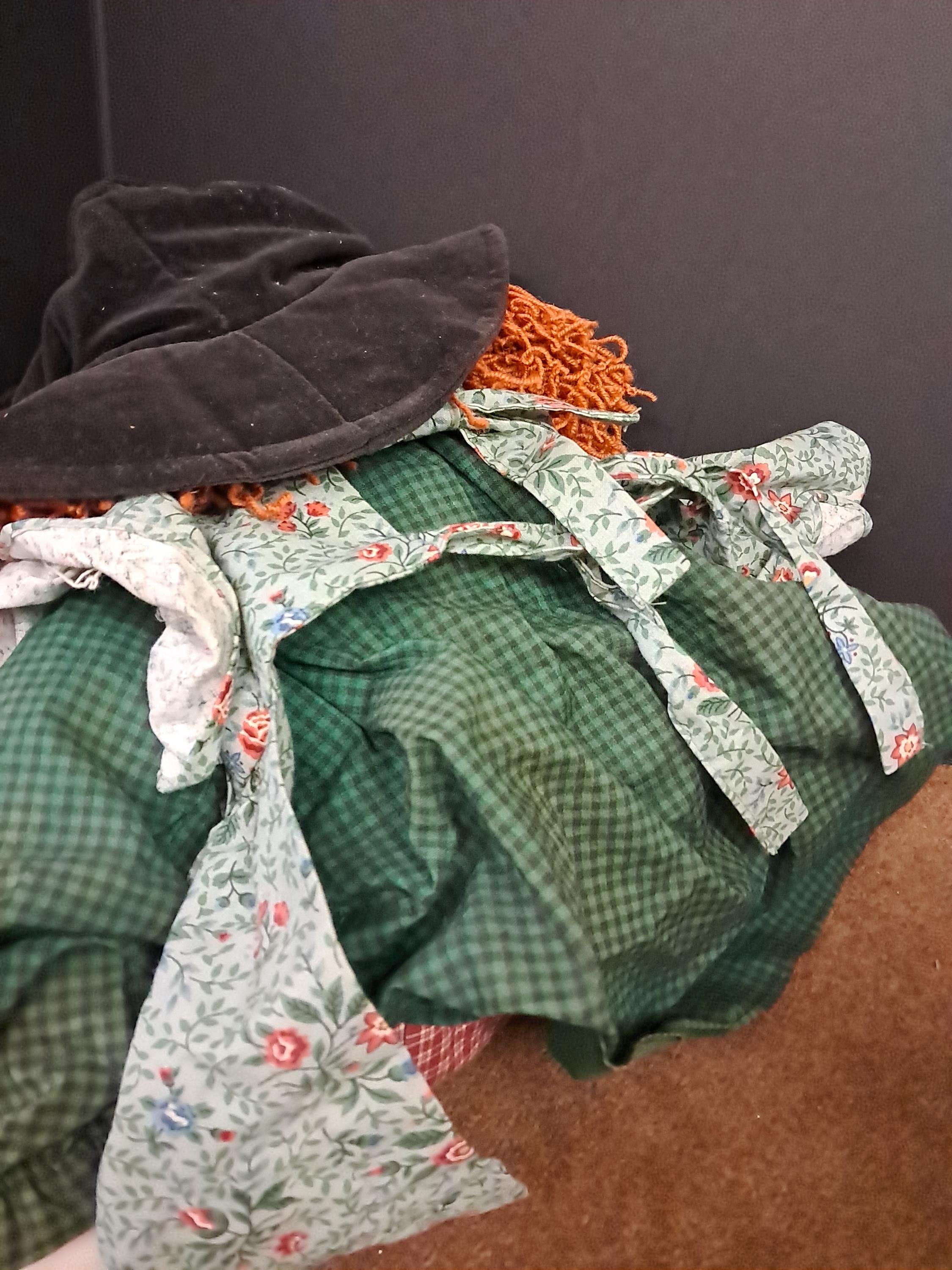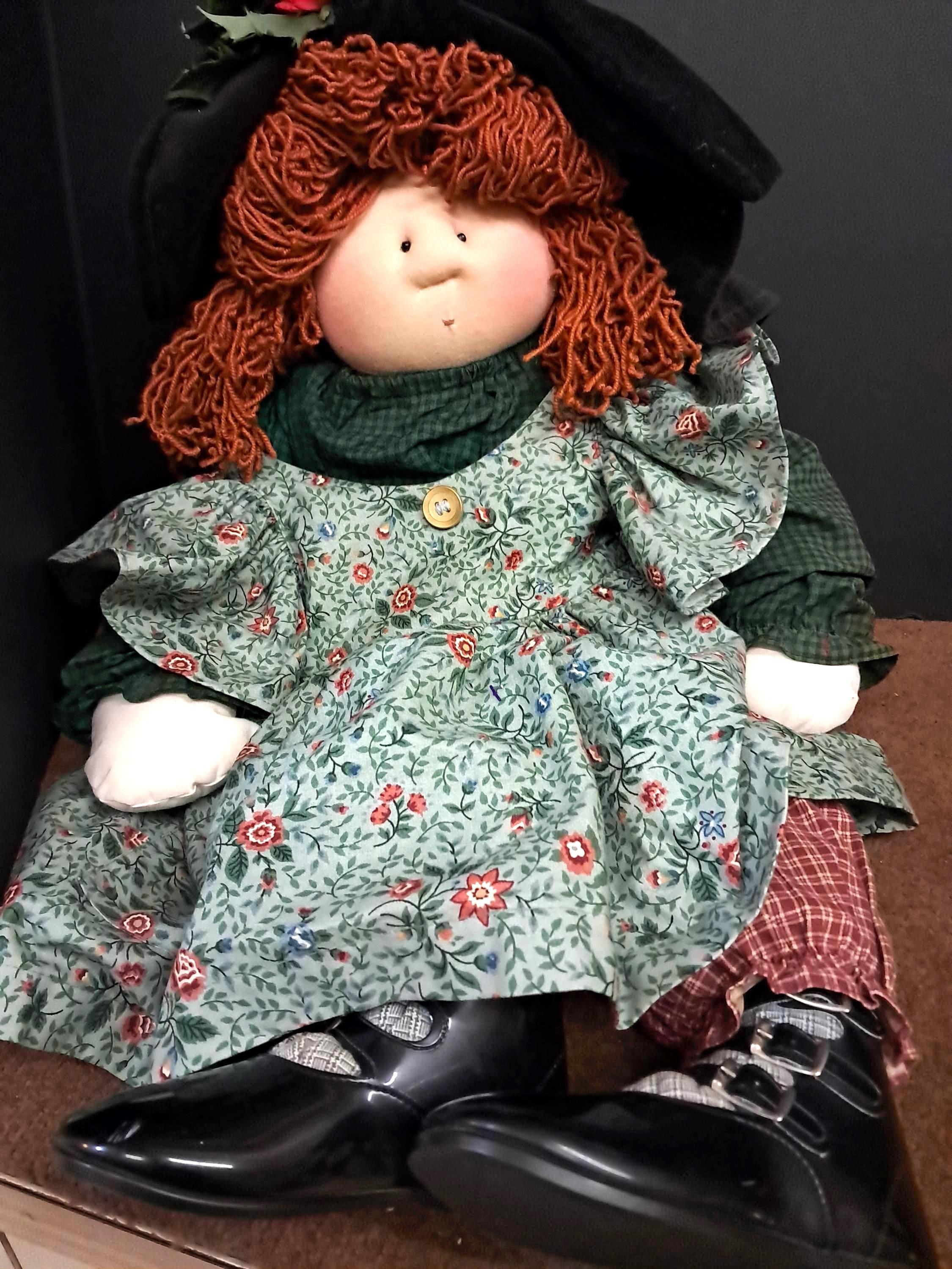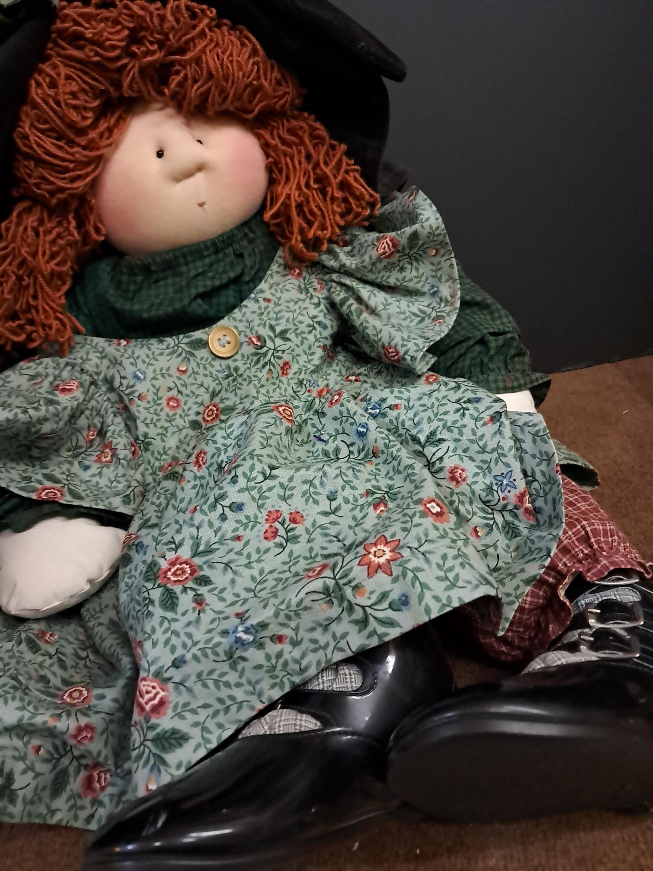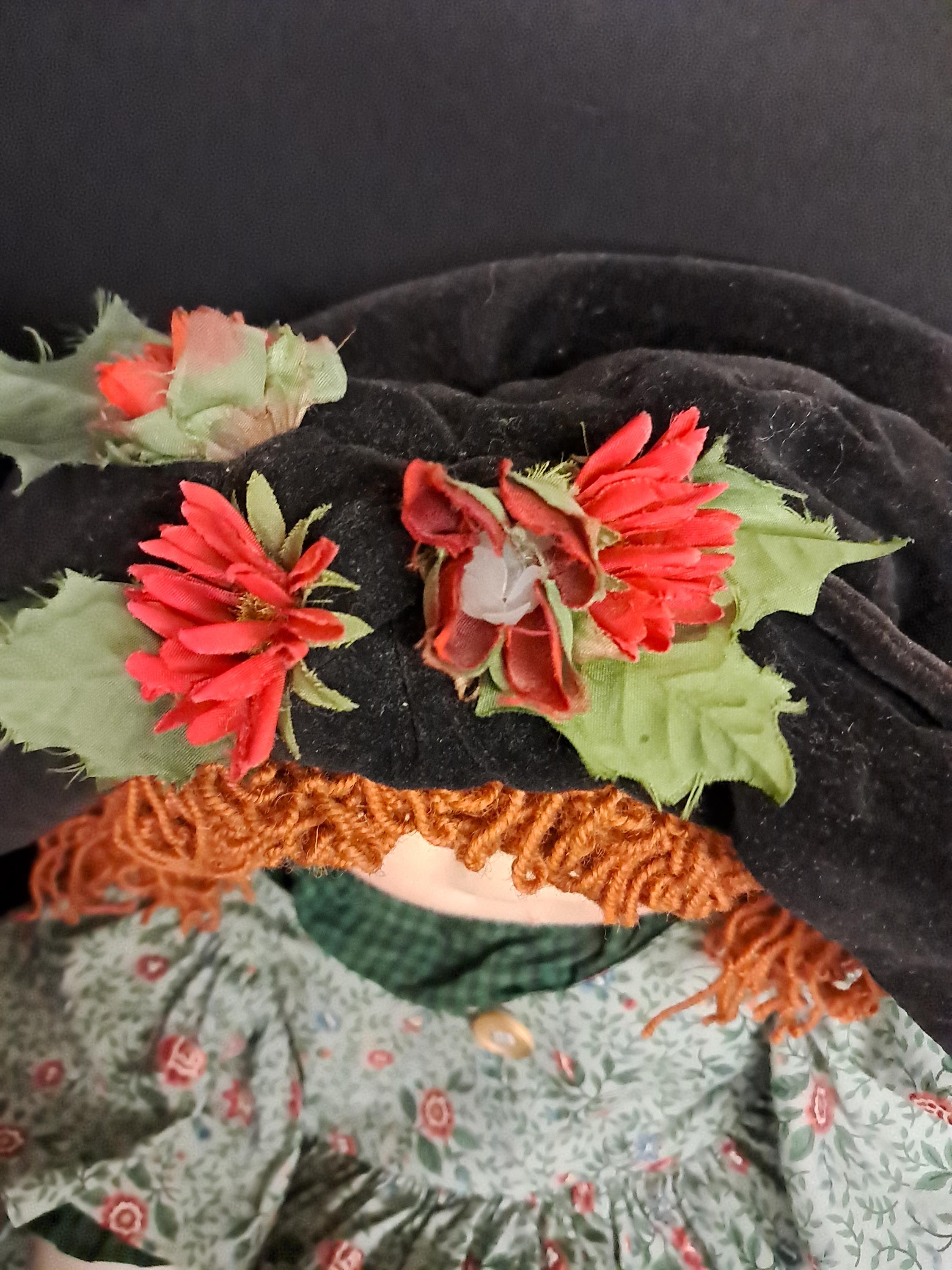 An amazing Little Souls Doll with bright red hair in a funky hair style under a black vintage hat. Her layers consist of a paisley cotton dress, a checkered orange pants, blue checkered shirt , and black velvet hat with flowers. she is awesome! 24 Inches.
