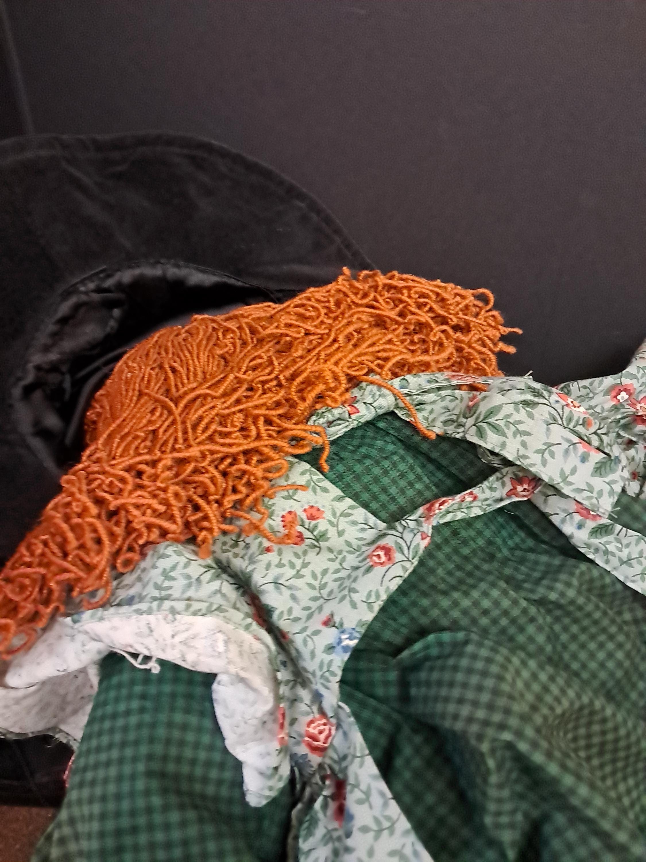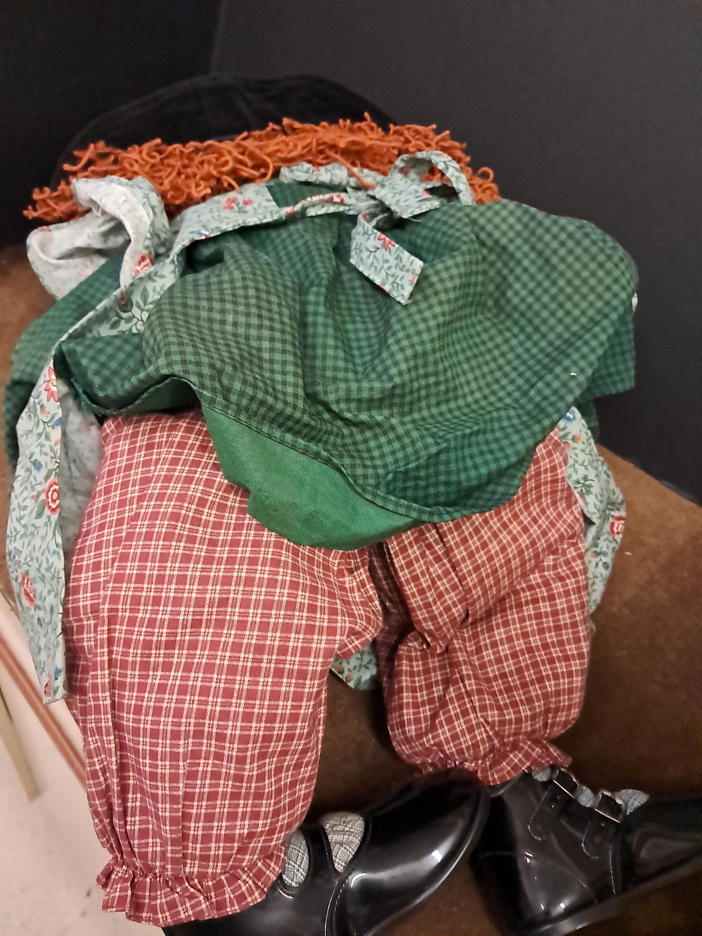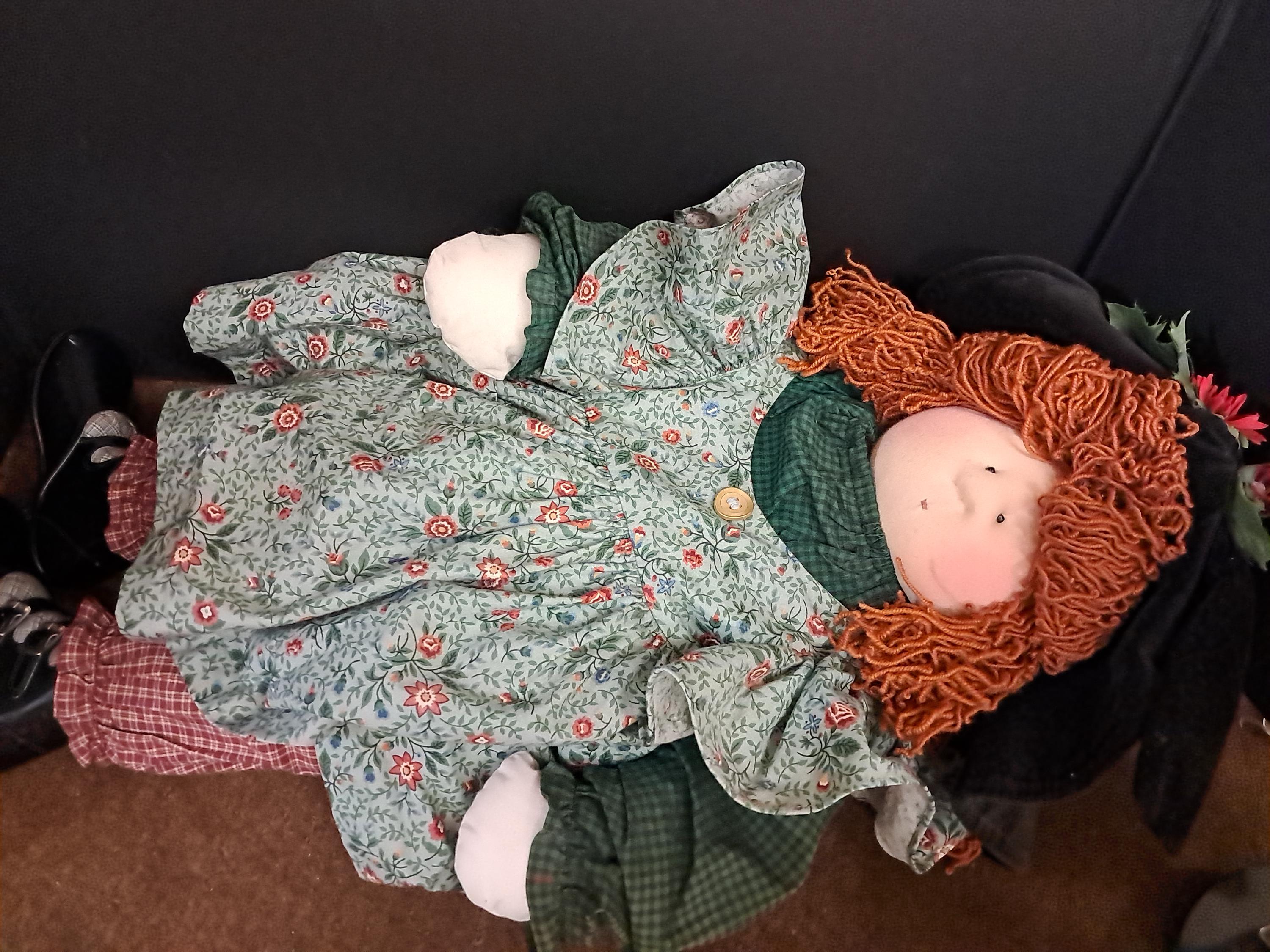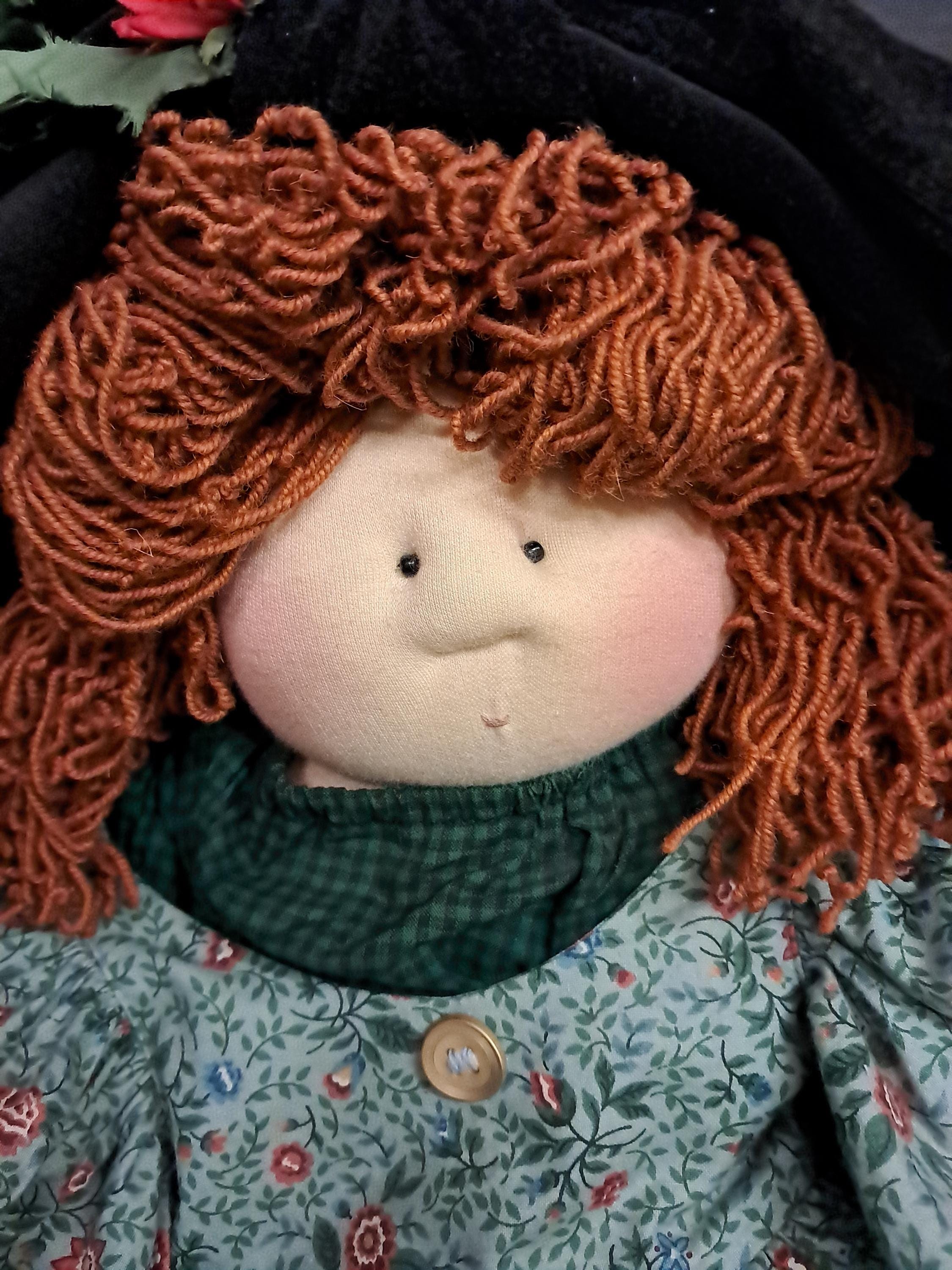 An amazing Little Souls Doll with bright red hair in a funky hair style under a black vintage hat. Her layers consist of a paisley cotton dress, a checkered orange pants, blue checkered shirt , and black velvet hat with flowers. she is awesome! 24 Inches.