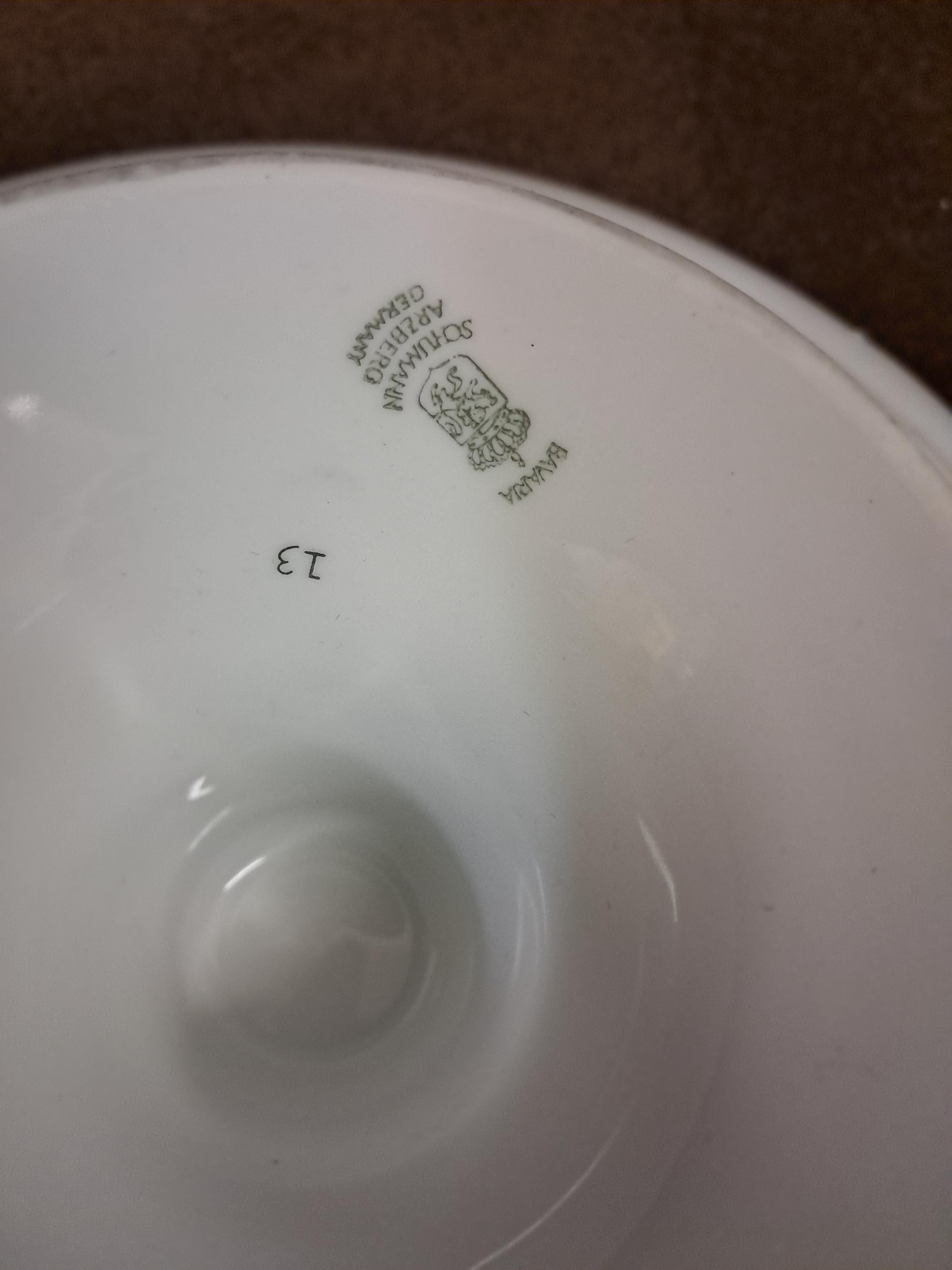 The factory was founded in 1881 by Christian Heinrich Schumann and a businessman Franz Ferdinand Riess. Porzellanfabrik Schumann & Riess was located in Arzberg, Bavaria, Germany. Christian Heinrich Schumann died in 1884. His youngest son Carl was to inherit the factory. As Carl was too young, the business was manages by his mother Christiana. When Carl was 21, he took over the factory. The company was in family hands until 1990, when it was taken over by Hutschenreuther. Production of this company stopped in 1994. imported from Germany, Czechoslovakia, and other European countries.