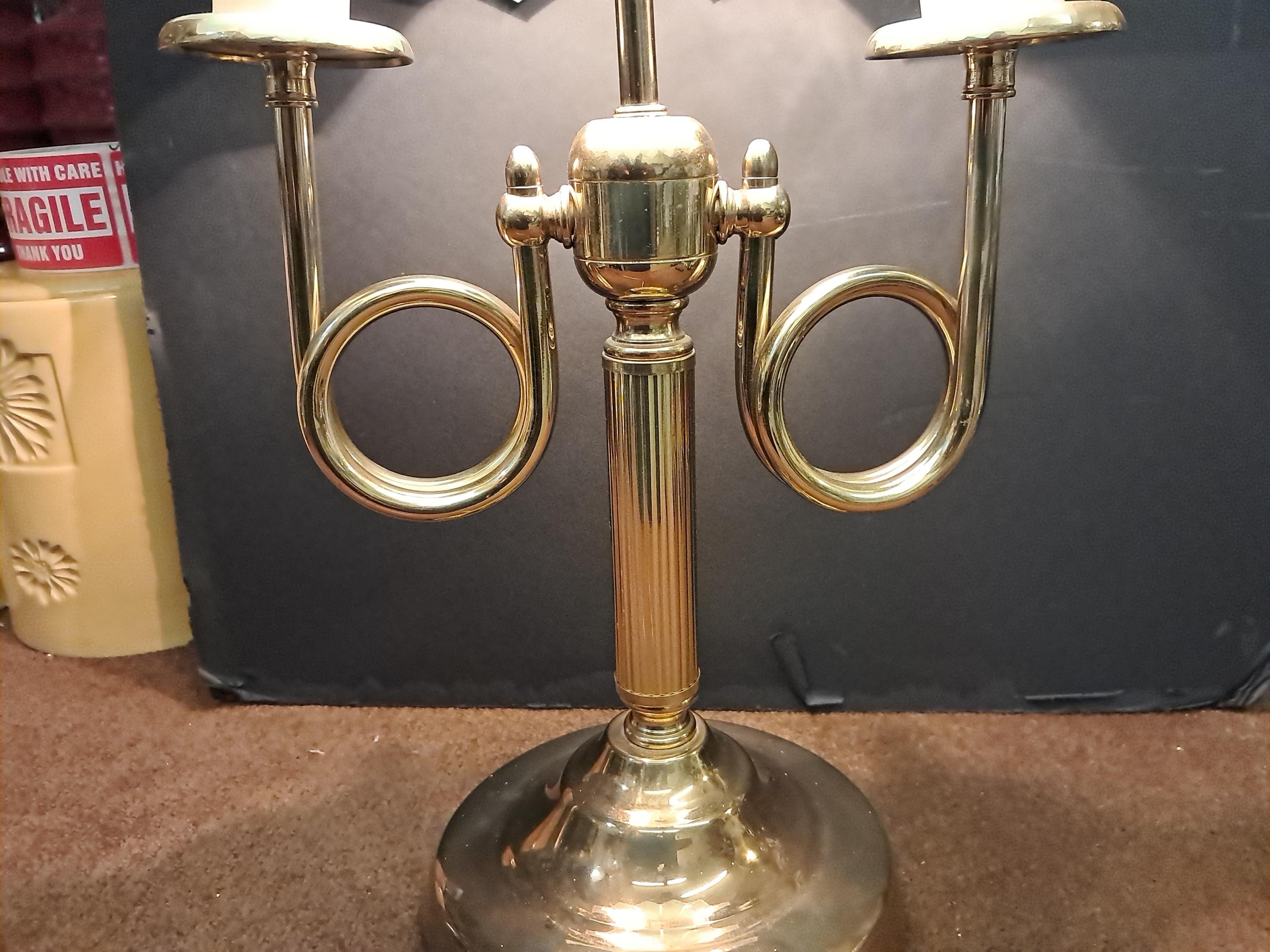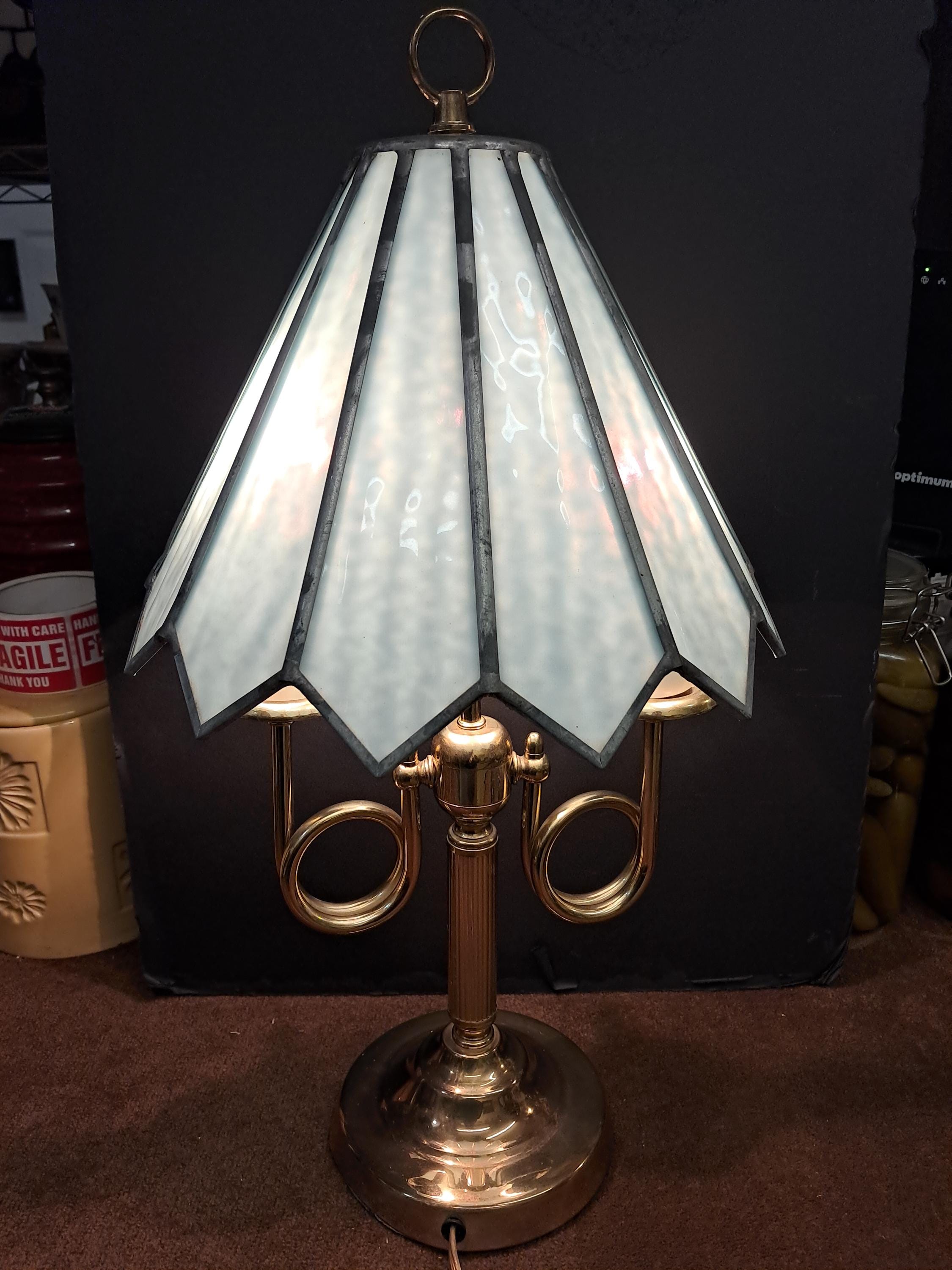 Together the stained Glass shade and brass Lamp measure 21" tall x 10 " wide
