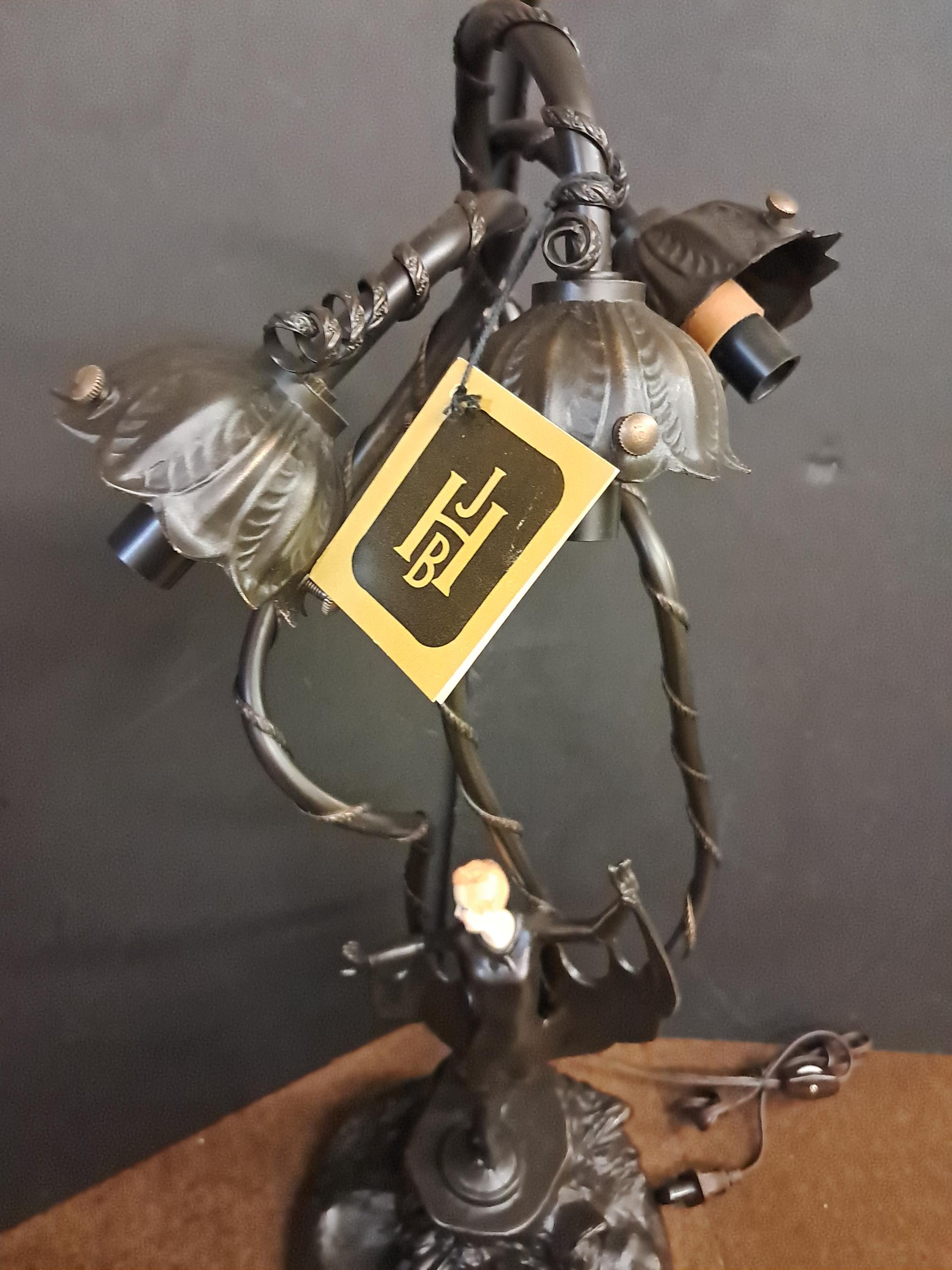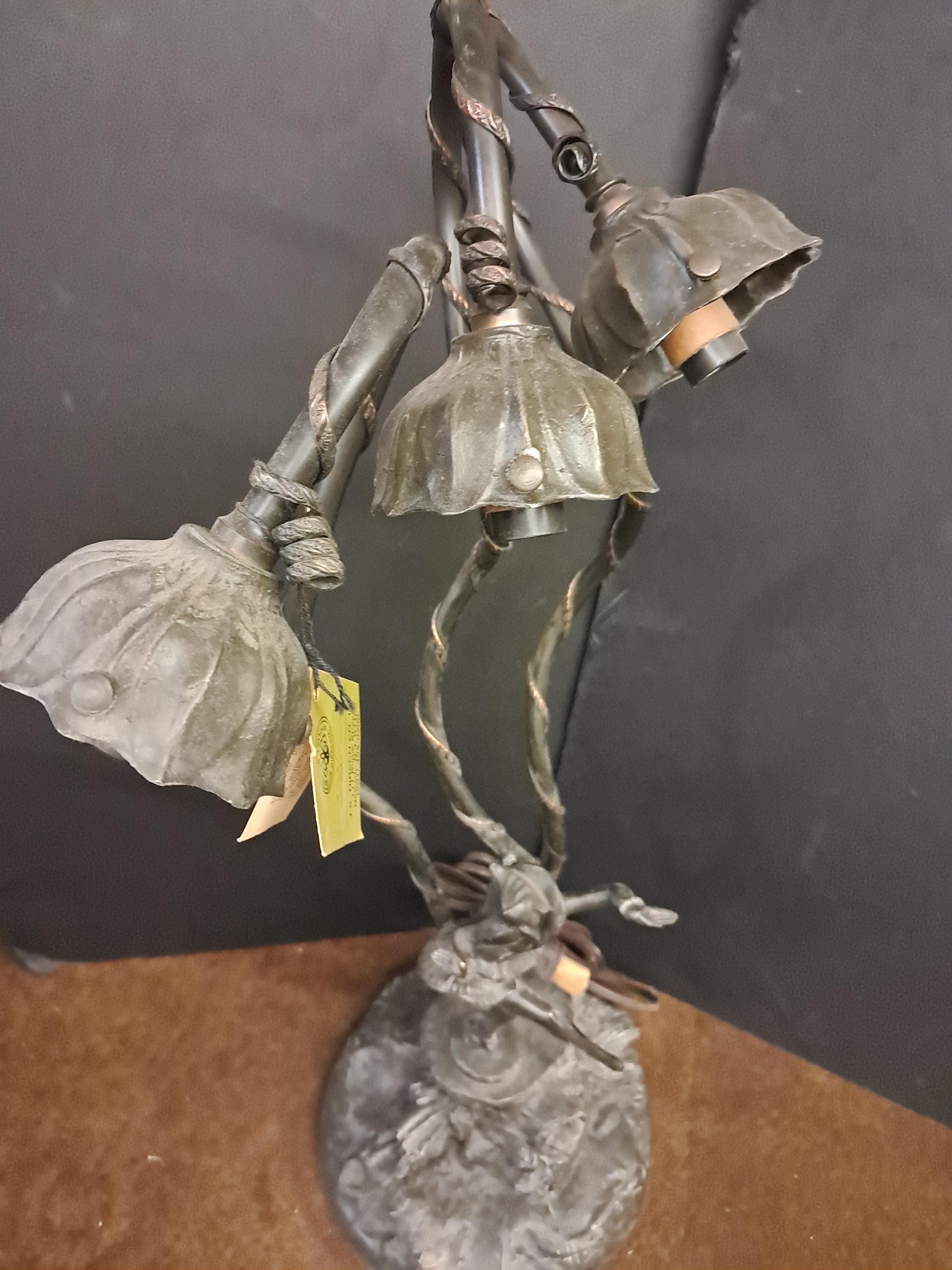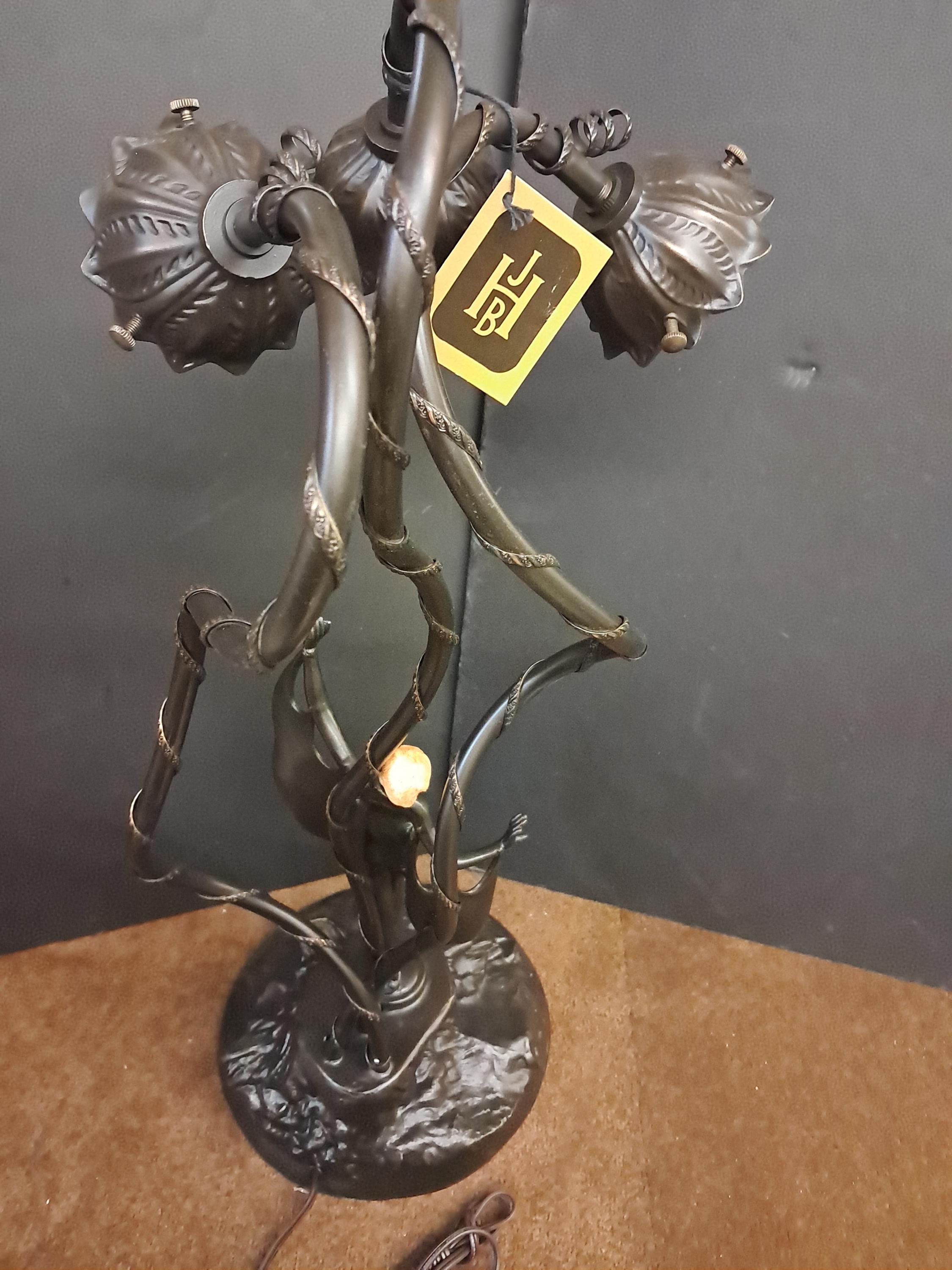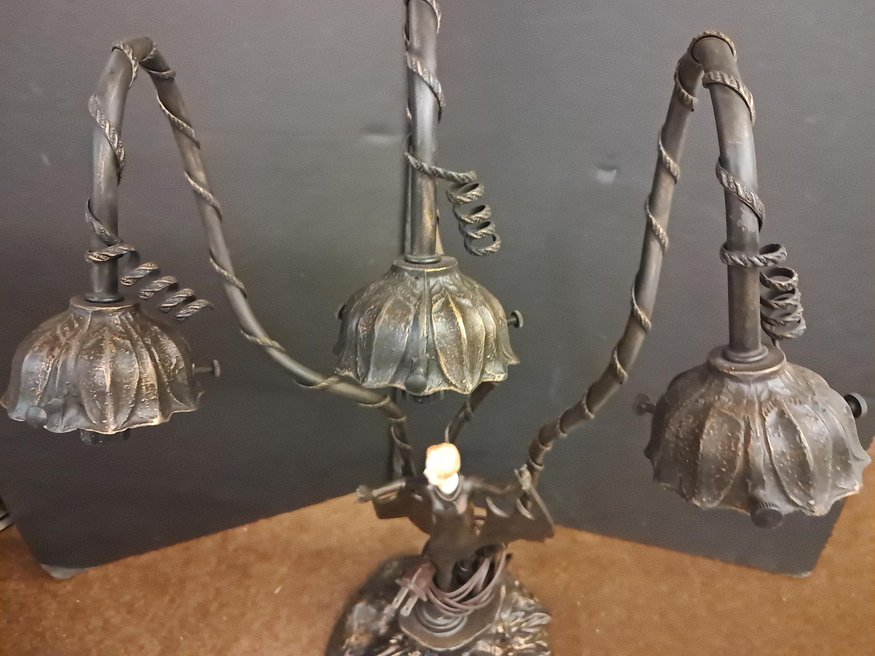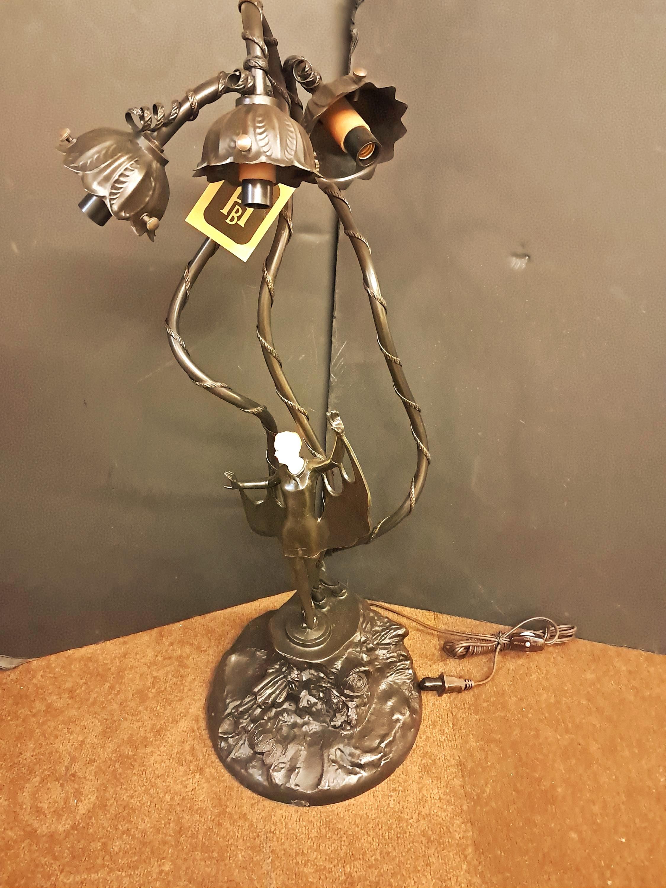 1 lamp has different statue in middle "Dancer on The Branch" , la Danse De Nymphos By Artist A. Moreau. This lamp Can not be verified if it is actually made by Moreau or duplicated by J.B. Hirsh
