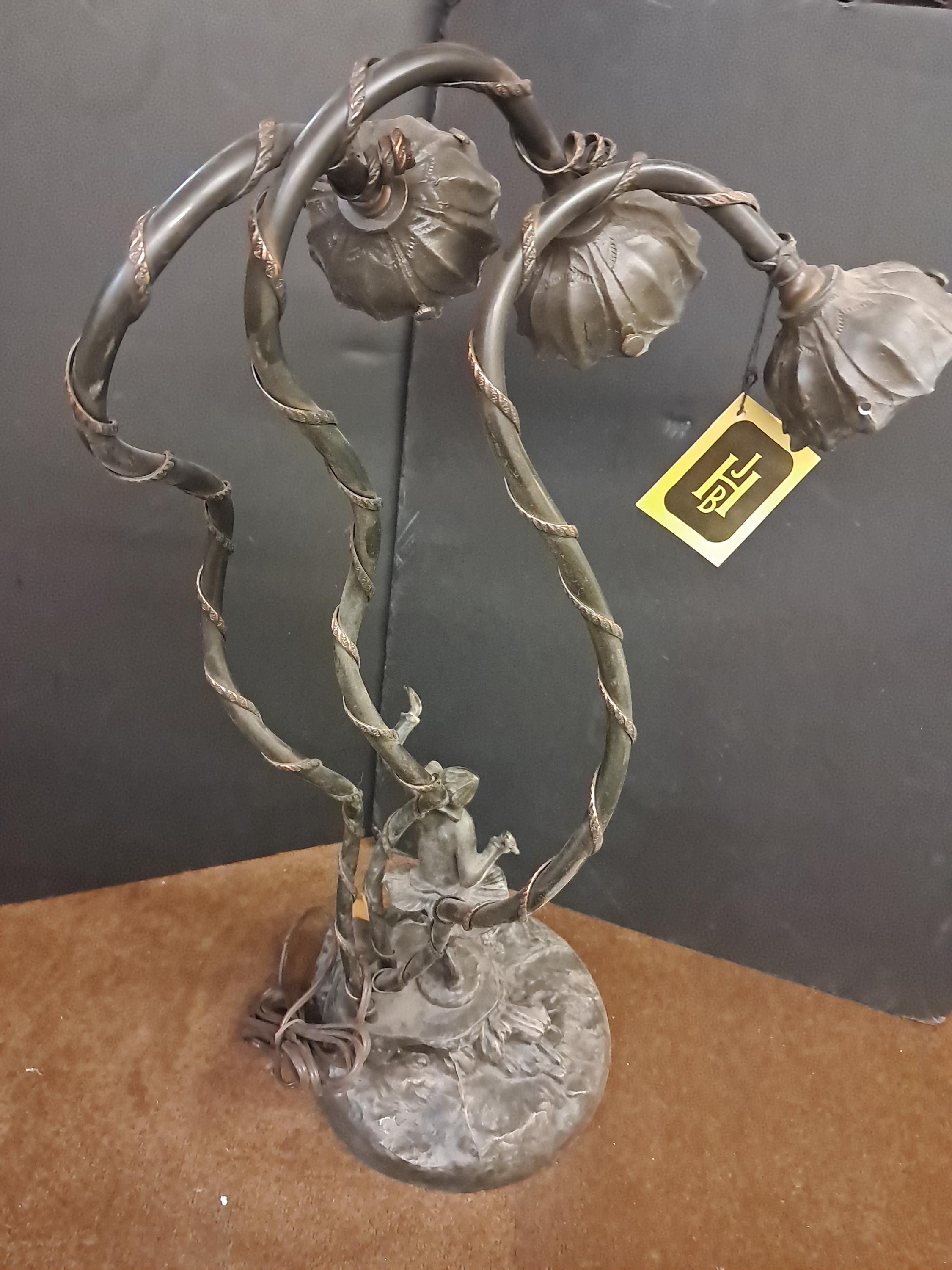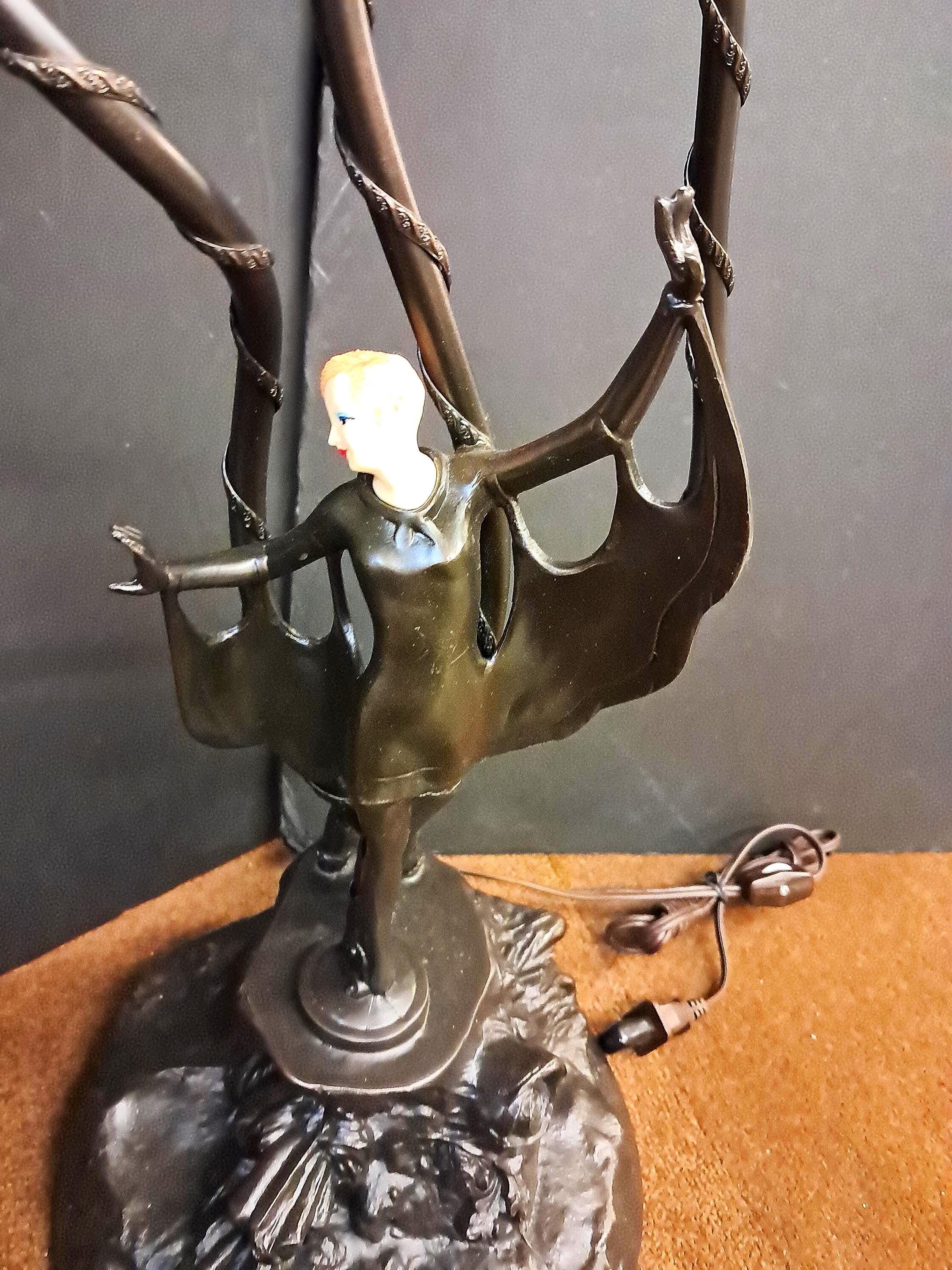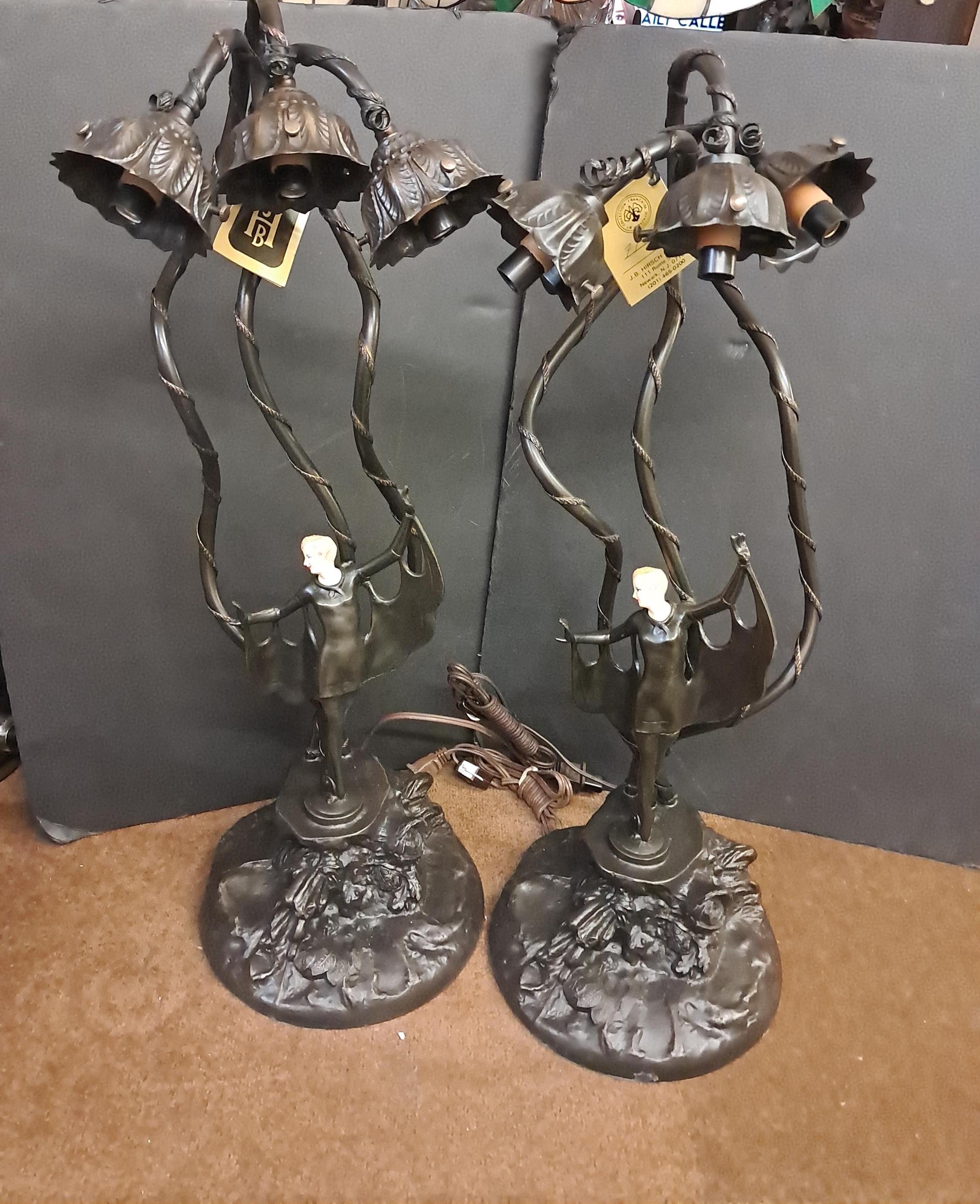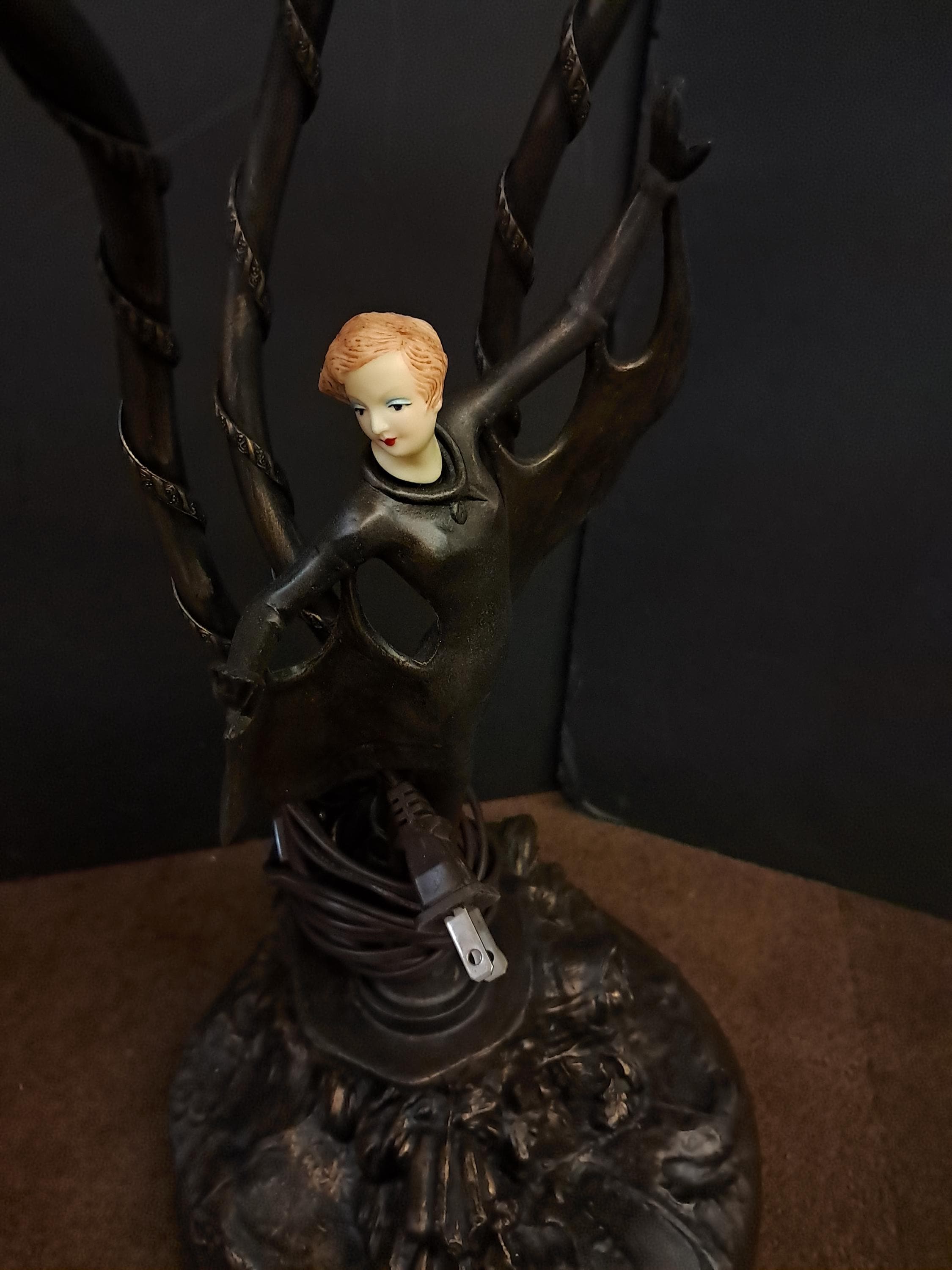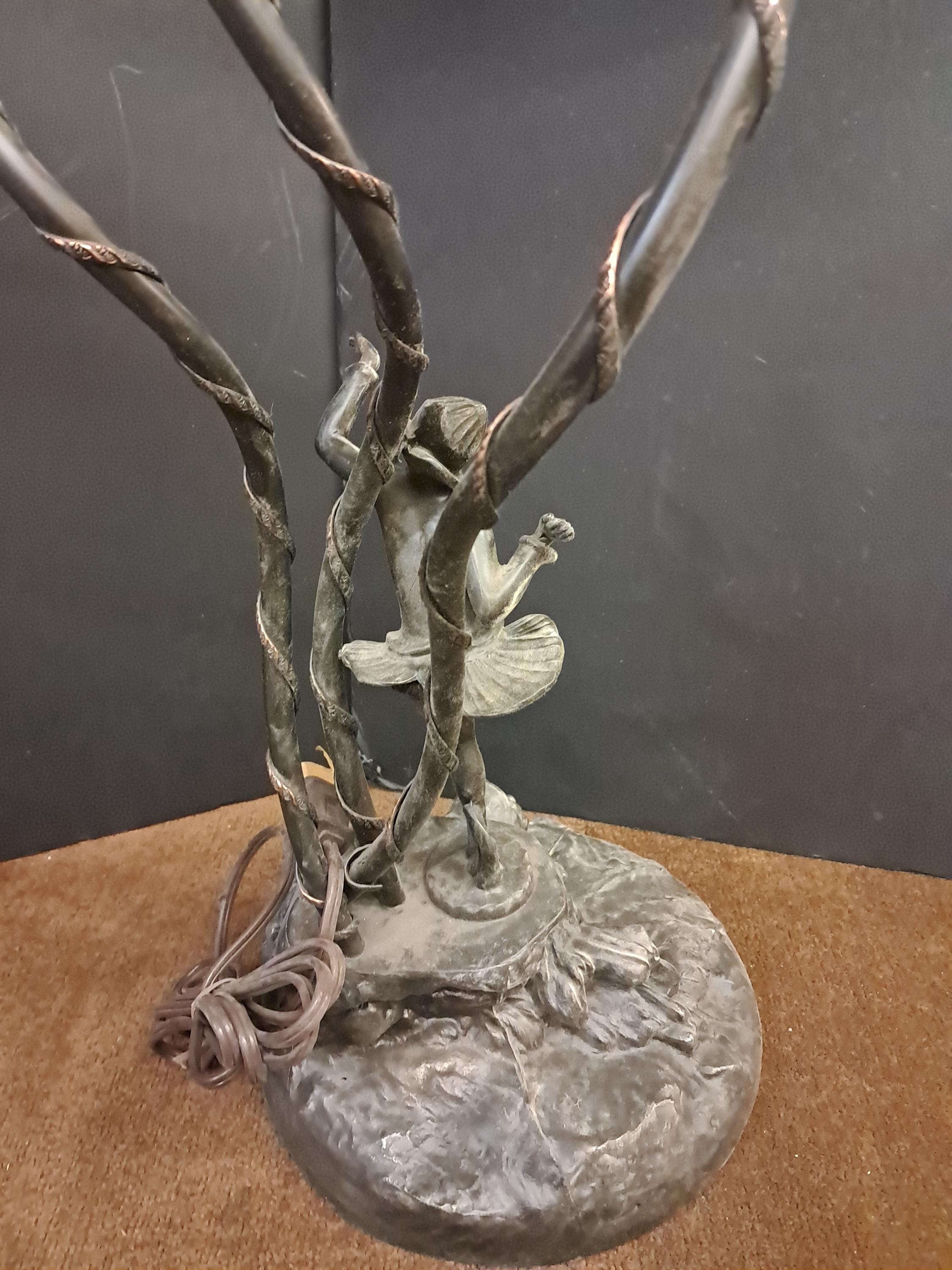 1 lamp has different statue in middle "Dancer on The Branch" , la Danse De Nymphos By Artist A. Moreau. This lamp Can not be verified if it is actually made by Moreau or duplicated by J.B. Hirsh