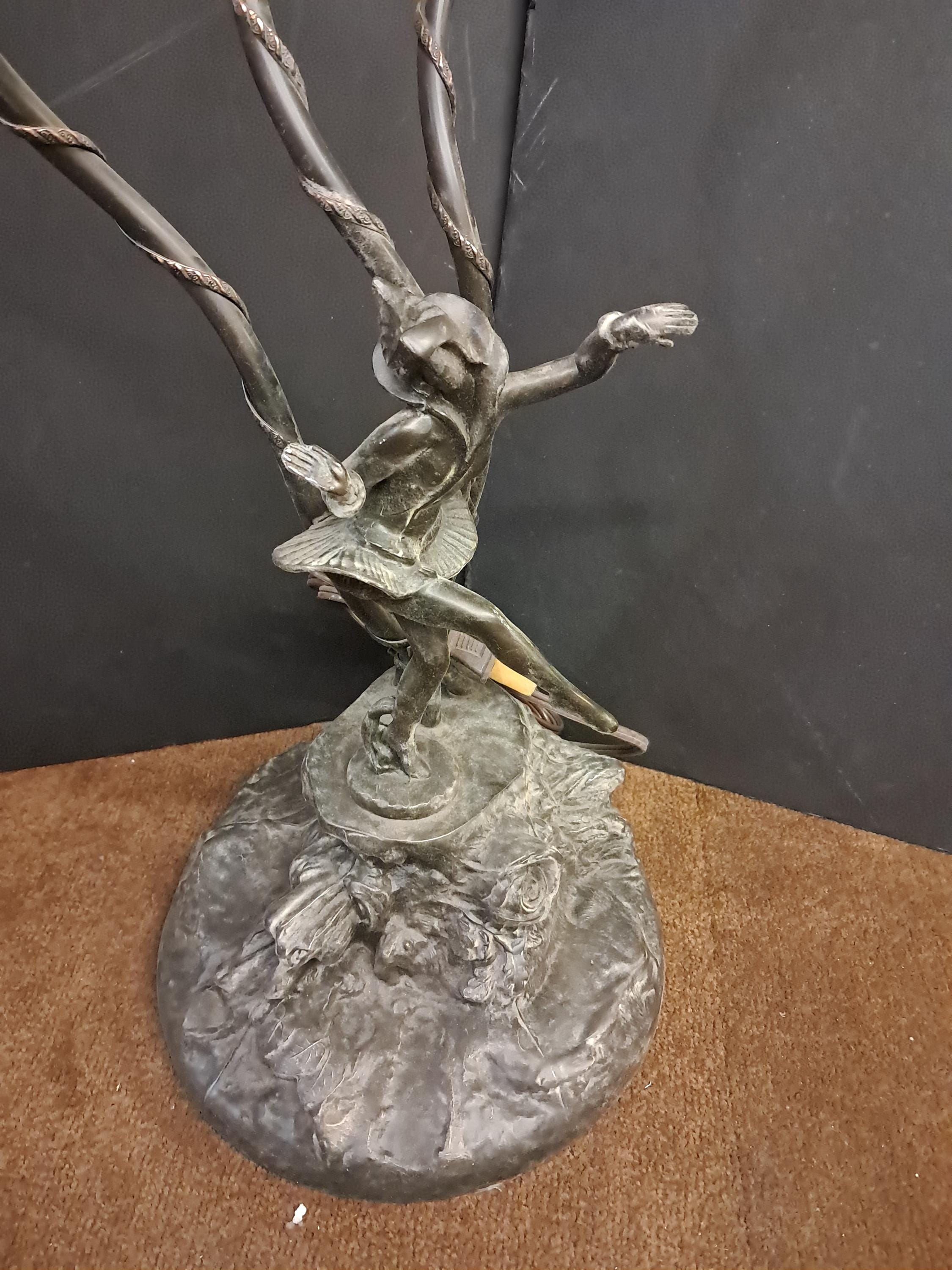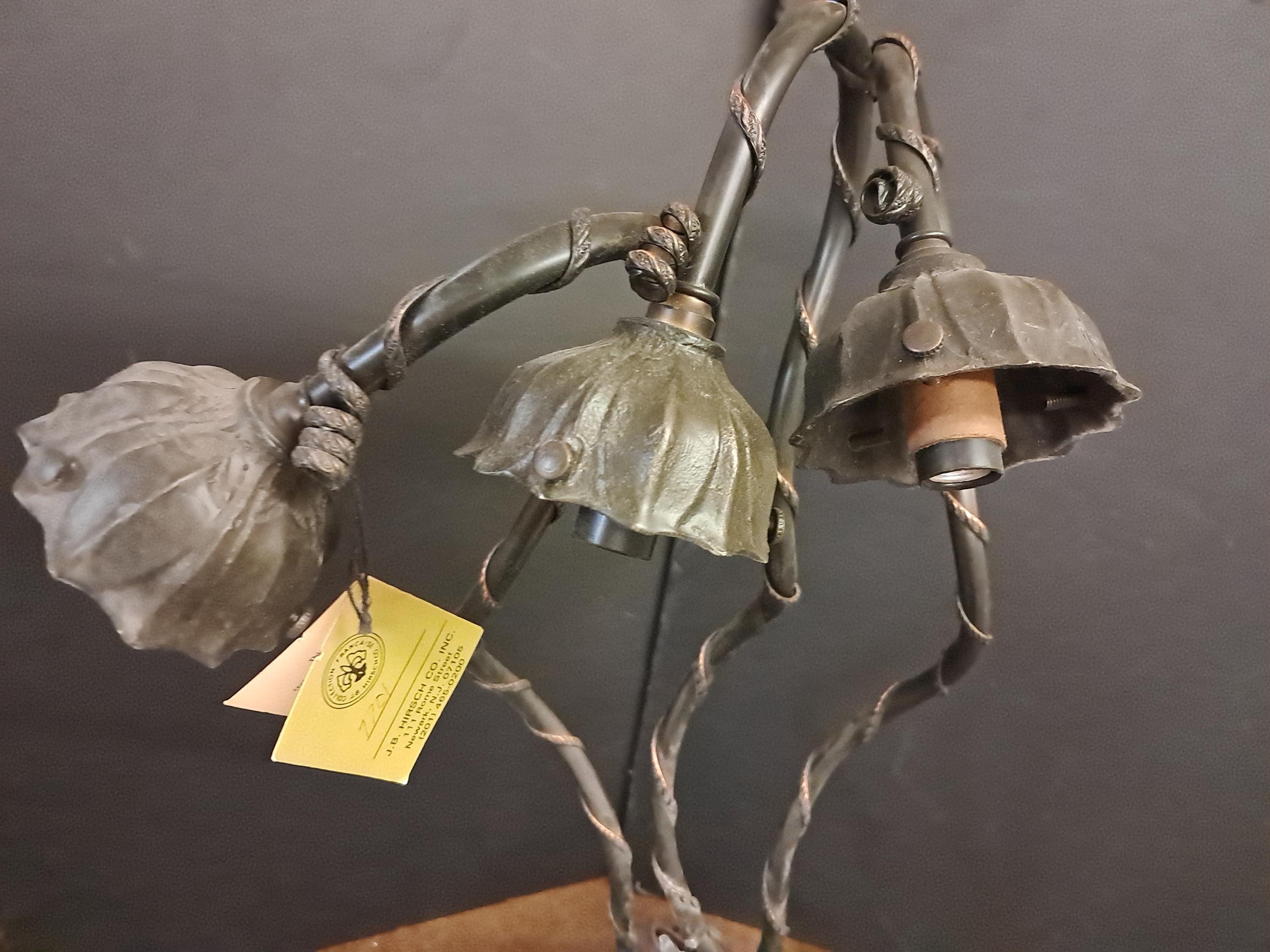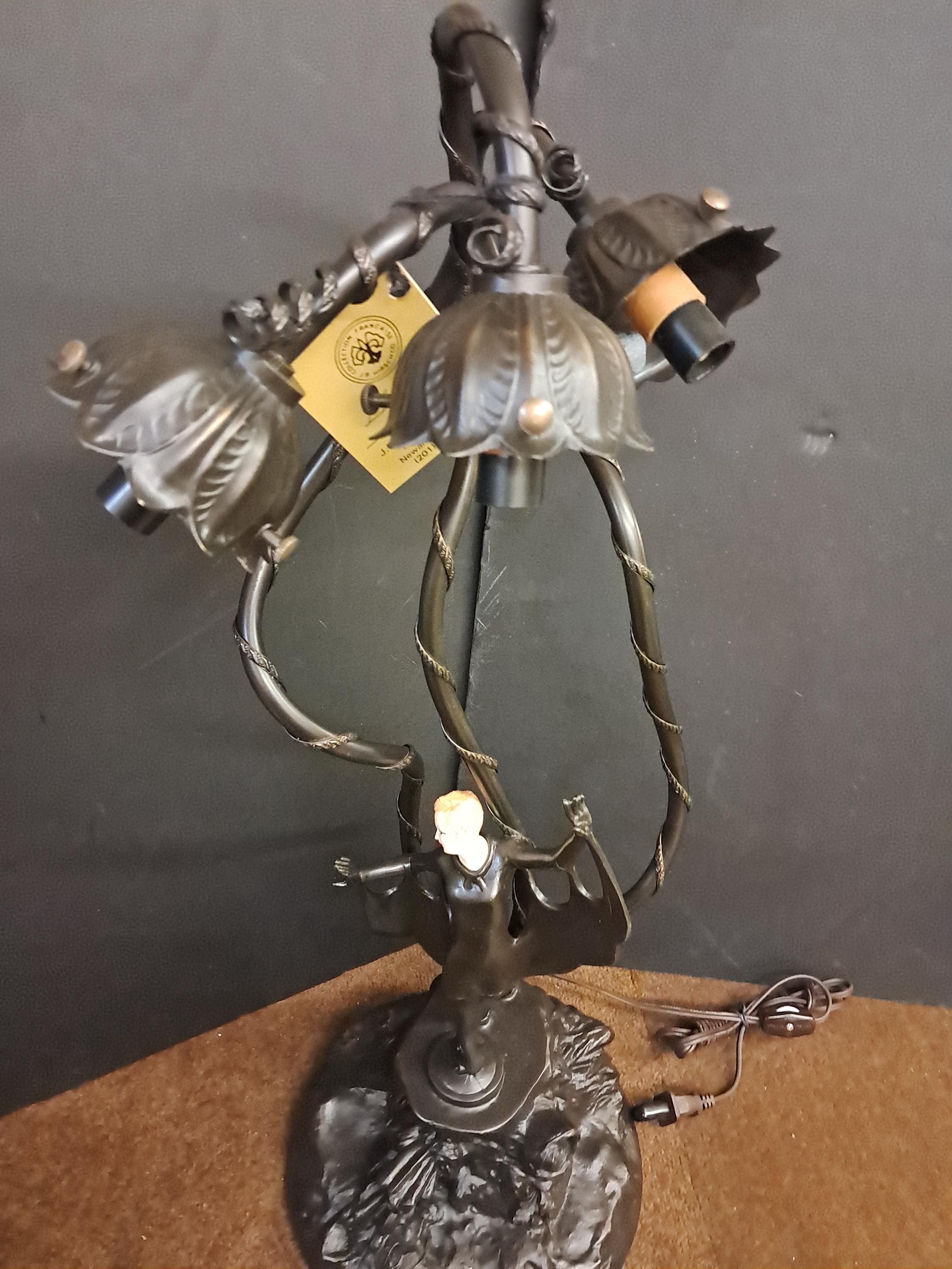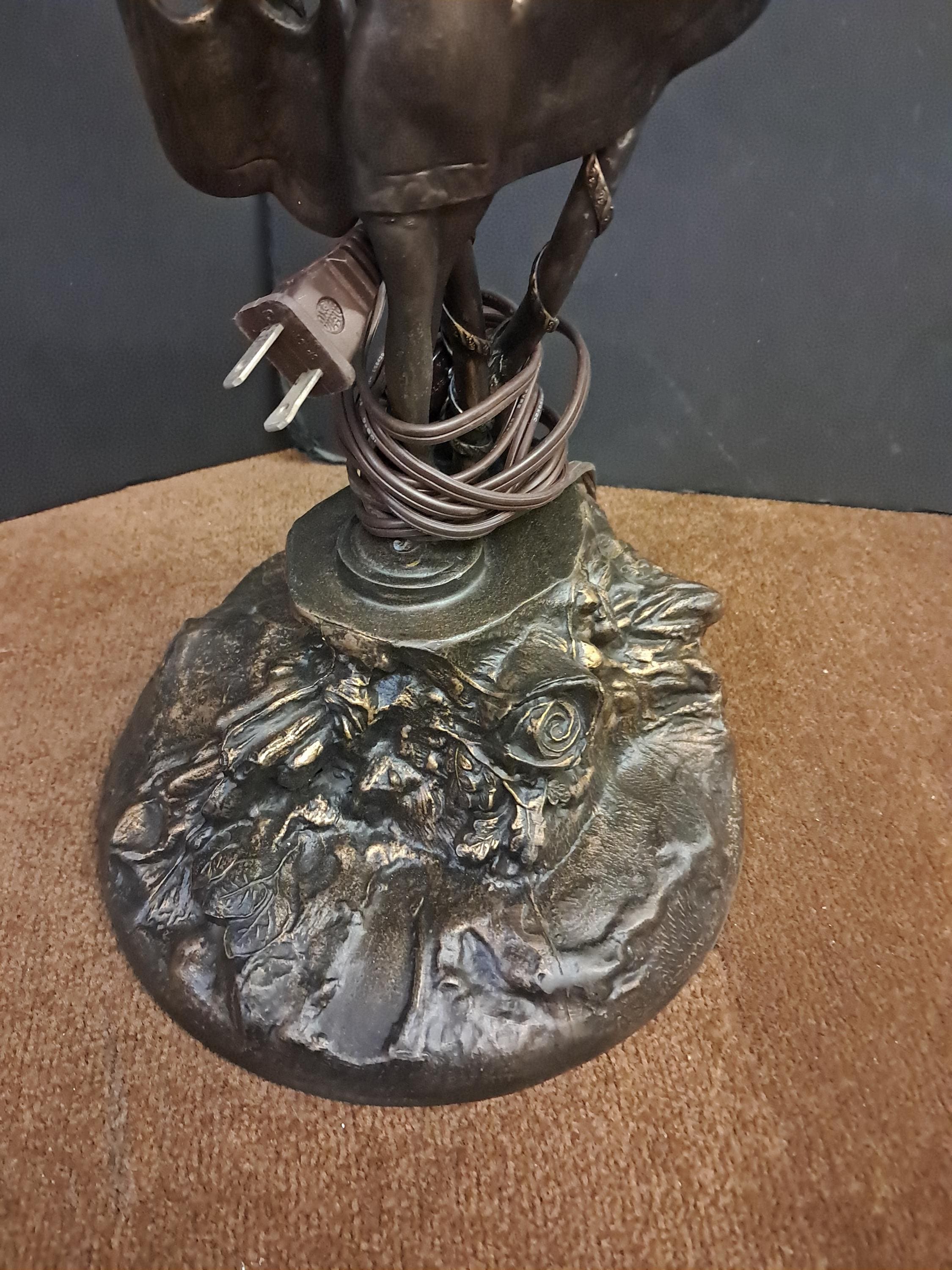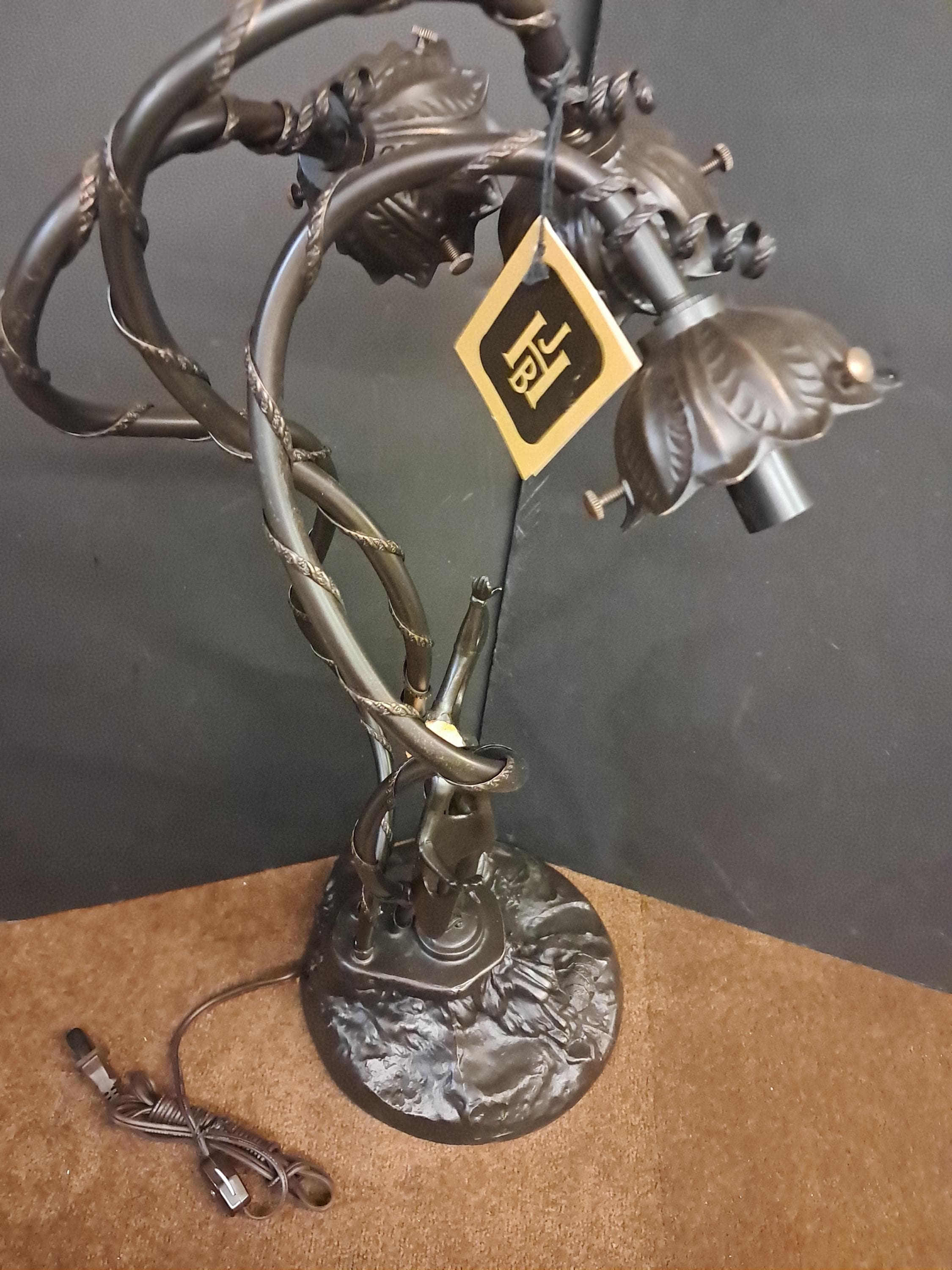 1 lamp has different statue in middle "Dancer on The Branch" , la Danse De Nymphos By Artist A. Moreau. This lamp Can not be verified if it is actually made by Moreau or duplicated by J.B. Hirsh