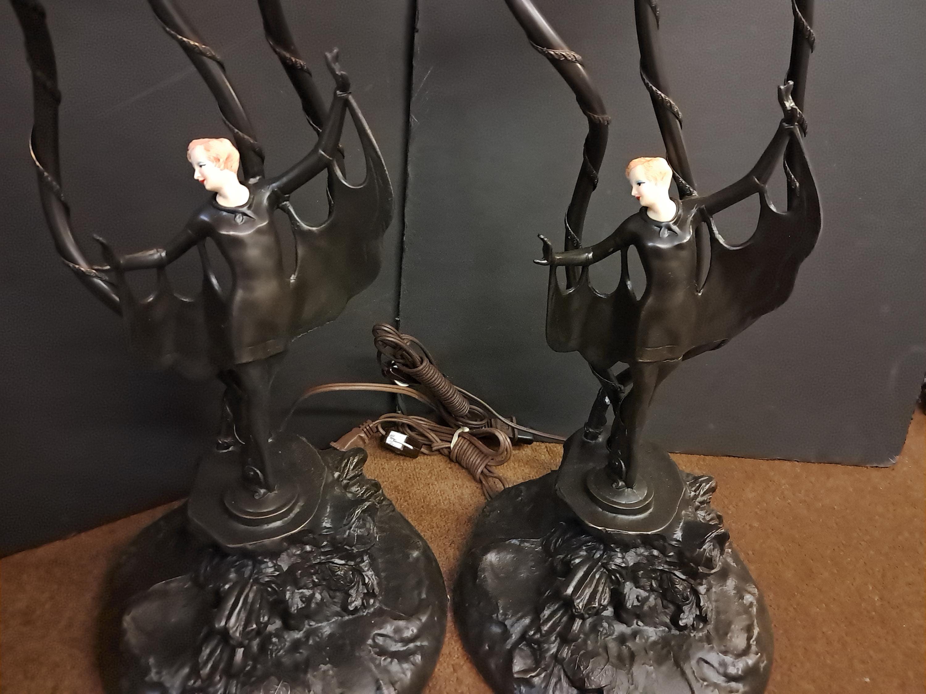 3 Lamps have exquisite Gerdago /Fugère /Hirsch design Art Deco Collectible produced by J.B. Hirsch in 1920's using original French molds acquired after World War I and sculpted namely by Henri Fugère, John Ruhl and Gerda Iro Gerdago. The latter was an Austrian Costume Designer and Sculptor famous for the elaborate Déco dance costuming of his PIXIES figures.