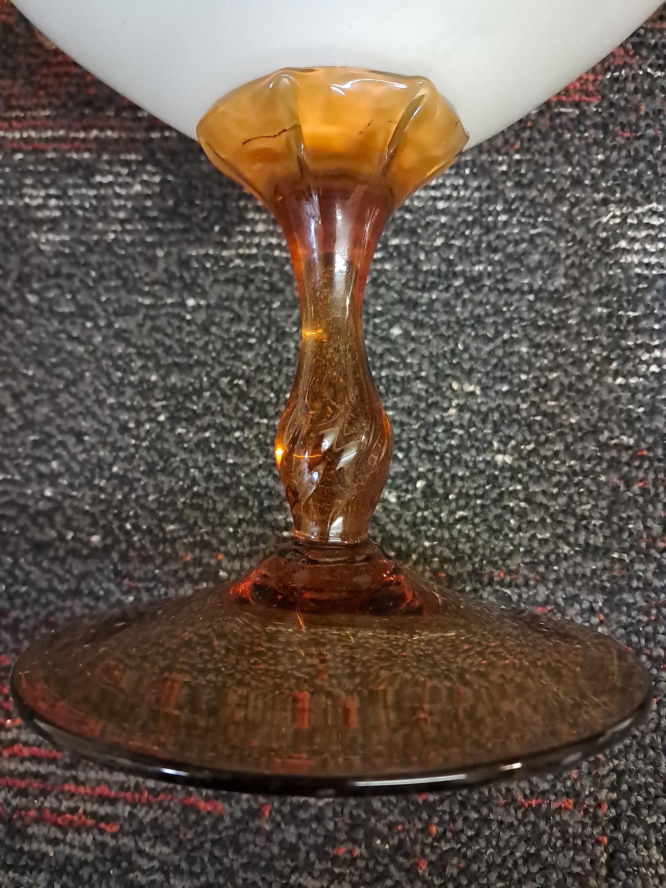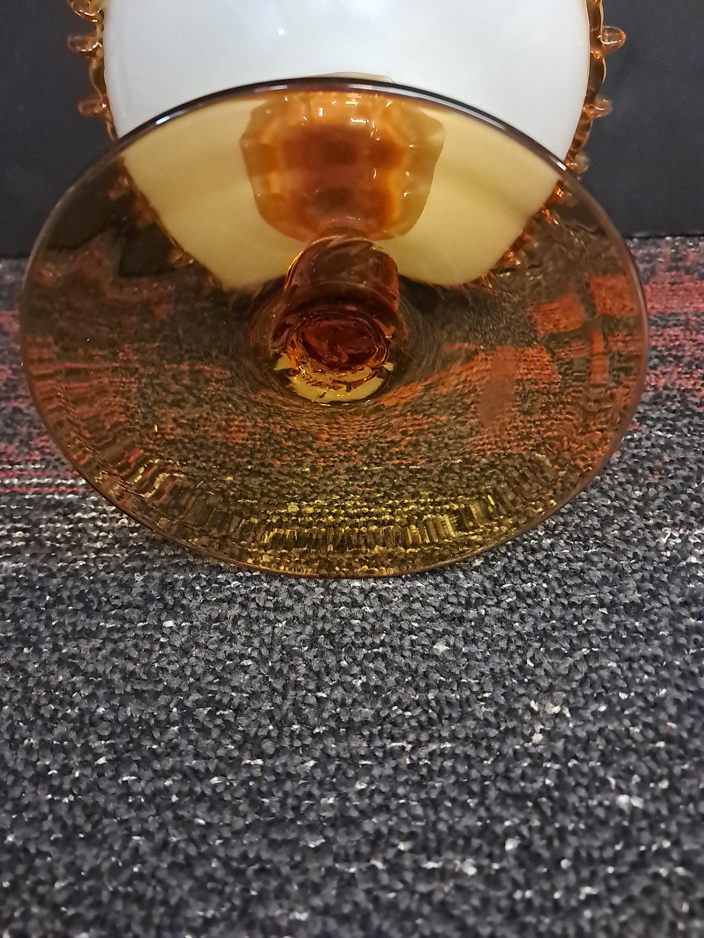Distinctive Lidded Design with a white body and Amber colored applied Glass trim and finial